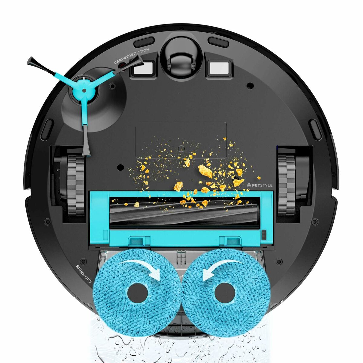 - Detecção ultrassónica de tapetes. O robot deteta quando há um tapete e aumenta a potência automaticamente para limpar com a máxima precisão e, se estiver no modo limpo, evita que o tecido do tapete não molhe com as suas mopas. Escova de silicone anti-emaranhamento. O seu design de silicone torna-o ideal para casas com animais de estimação, pois evita que os cabelos se liem. Além disso, as suas pás ajudam a desintegrar e a apanhar a sujidade em qualquer superfície.