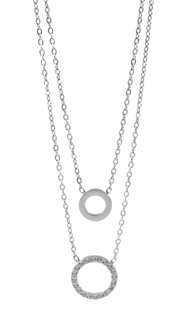 Ronia -este colar moderno impressiona pelo seu design estiloso e versátil, que dá um toque especial a cada look. É composto por duas correntes, uma em cima da outra, que se combinam harmoniosamente entre si: Corrente 1: Comprimento de 36 cm + extensão de 5 cm. O pingente fixo em forma de círculo aberto com diâmetro de 10 mm confere à corrente uma elegância sutil. Corrente 2: Comprimento de 40 cm + extensão de 5 cm. O pingente maior, também de círculo aberto, com 14 mm de diâmetro, é incrustado com pedras cintilantes que brilham na luz e dão um toque de glamour. Ambas as correntes estão equipadas com um prático fecho lagosta que facilita a colocação e a retirada, garantindo ao mesmo tempo uma fixação segura.