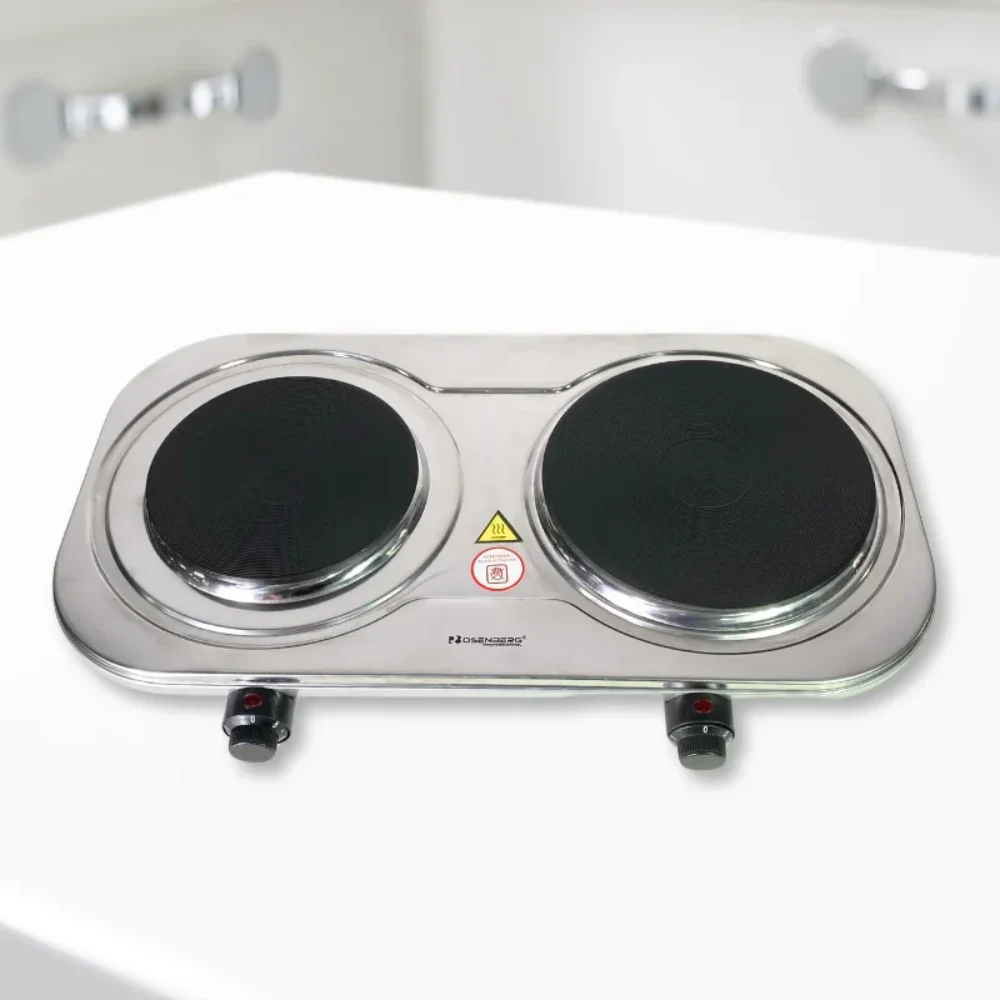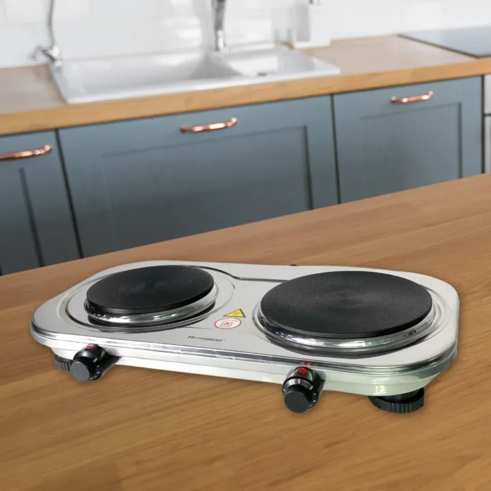 Construído em ferro e aço de alta qualidade, este fogão elétrico duplo é feito para durar, ao mesmo tempo em que adiciona um visual elegante e moderno à sua cozinha. Ele vem com um termostato ajustável, permitindo que você controle a temperatura de cada fogão de forma independente. Quer você precise de uma fervura suave para molhos delicados ou fogo alto para ferver água, este fogão oferece controle preciso para atender às suas necessidades de cozimento. A luz indicadora fornece uma indicação visual clara quando o fogão está em uso, garantindo a segurança ao evitar o contato acidental com a superfície quente.