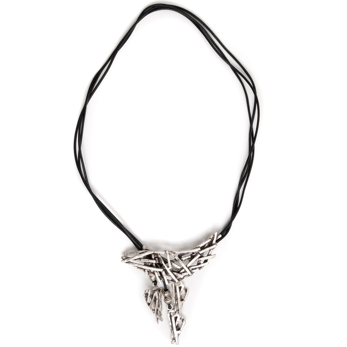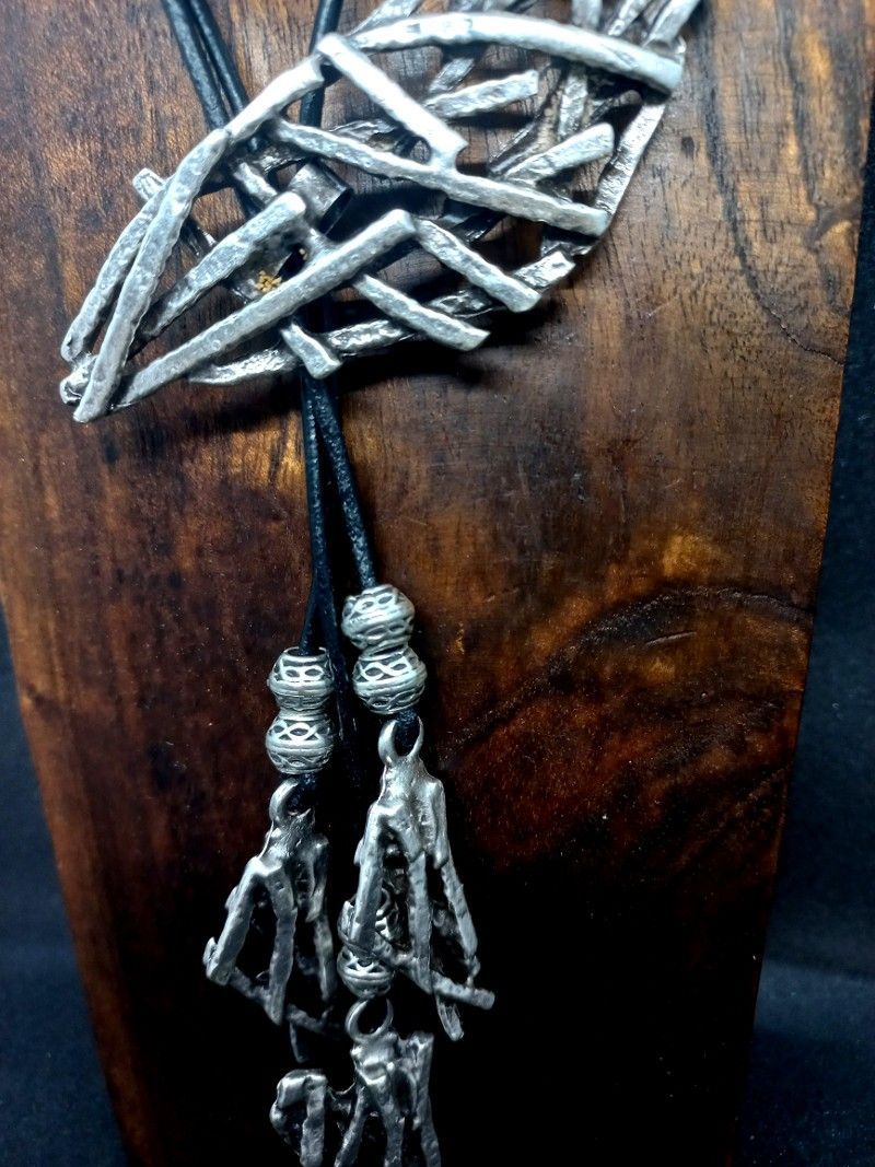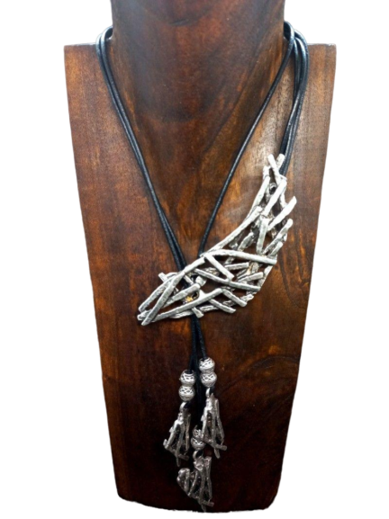 O fio em pele e as peças trabalhadas à mão garantem um acabamento artesanal único, que se destaca instantaneamente.