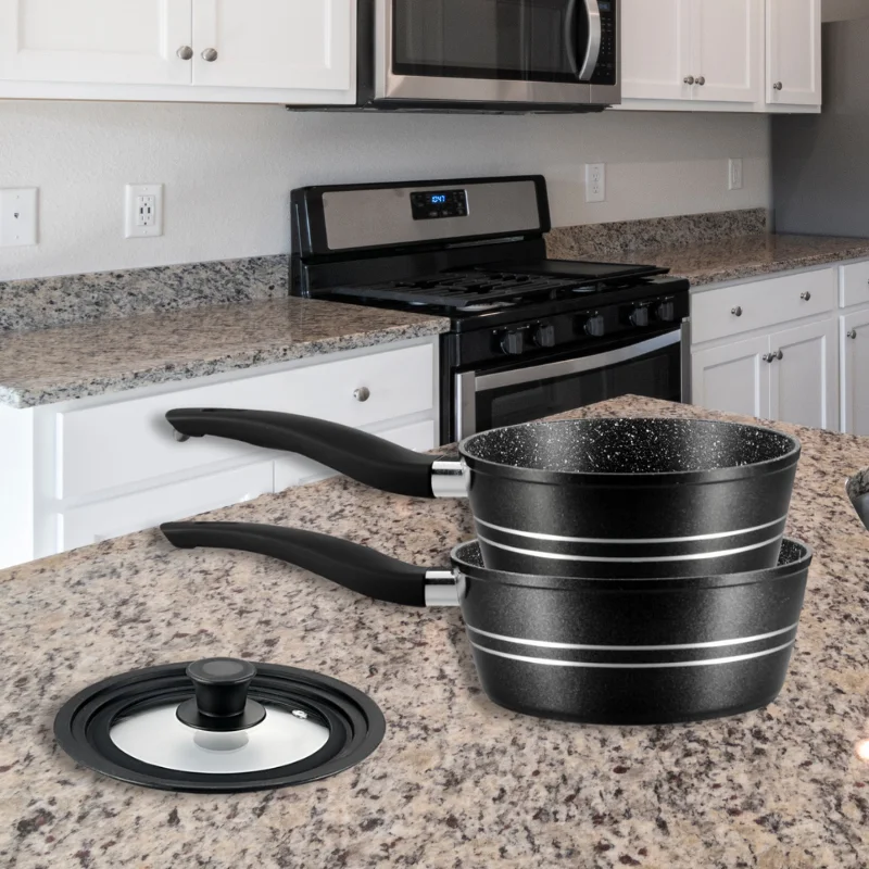 - Conjunto versátil: Este conjunto abrangente inclui duas panelas com tampas de silicone, oferecendo opções para diversas tarefas de cozimento. Os tamanhos incluem uma panela de 18 cm e uma panela de 20 cm.