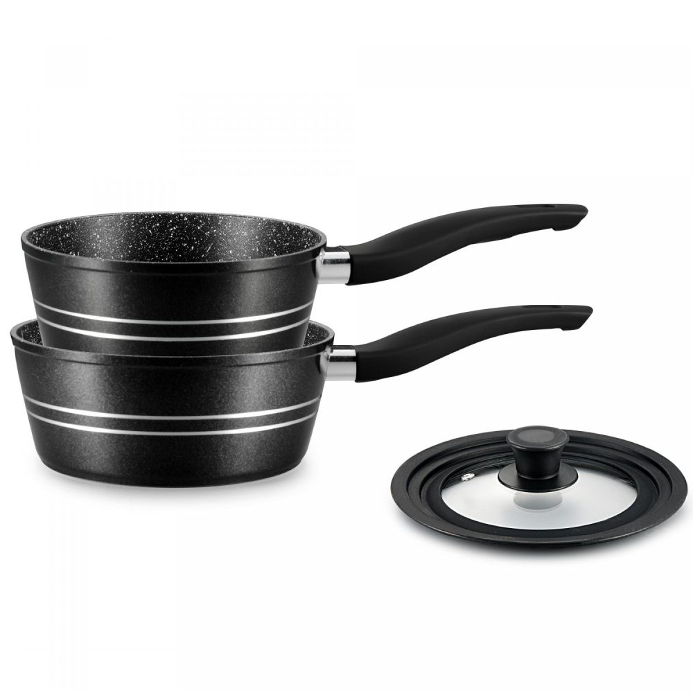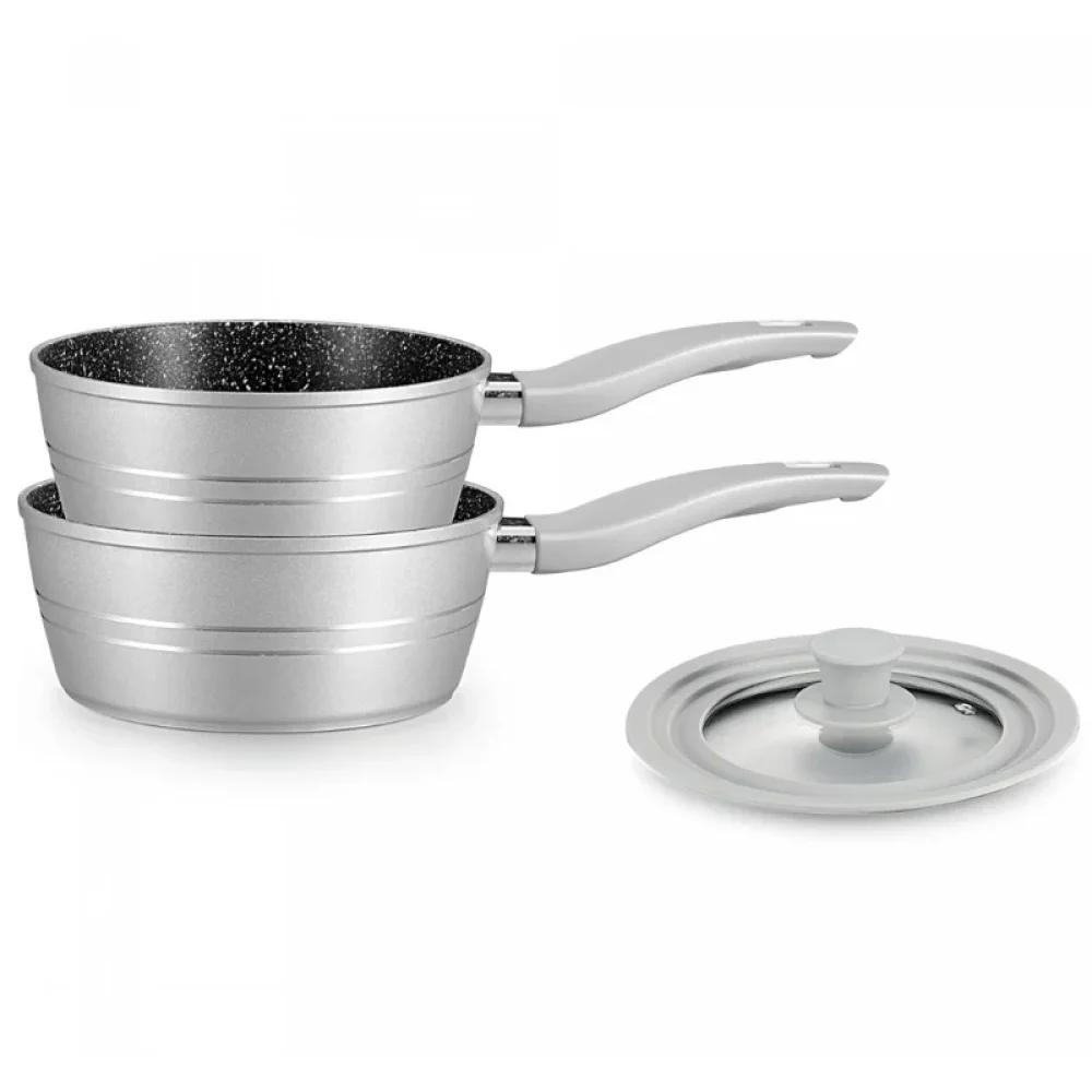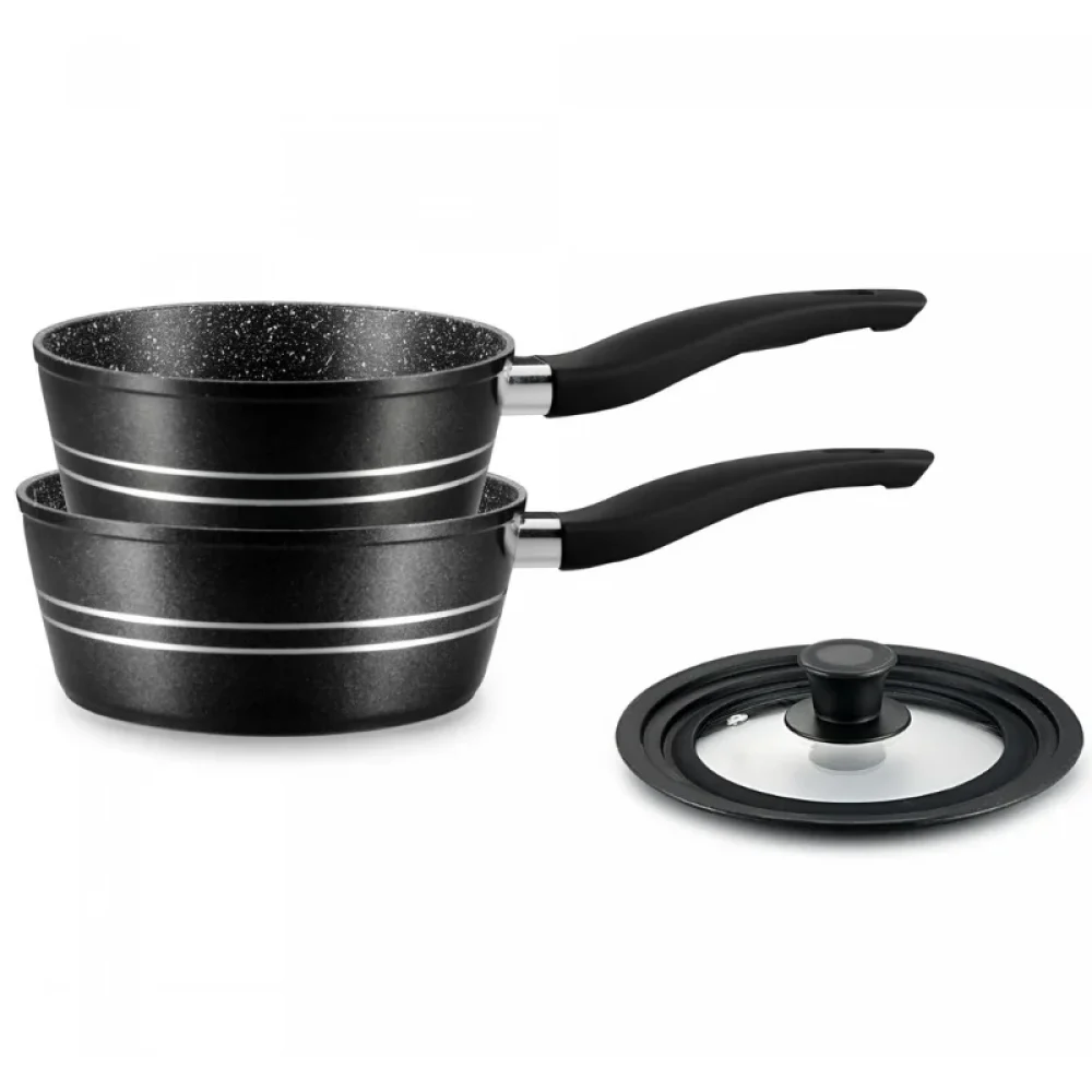 Atualize sua experiência culinária com o conjunto de panelas revestidas de mármore de 3 peças da Royalty Line RL-FS2M, uma adição versátil à sua cozinha que combina sem esforço estilo, funcionalidade e consciência ambiental. Este conjunto abrangente inclui duas panelas, cada uma equipada com uma tampa de silicone para maior comodidade. A primeira panela mede 18cm de diâmetro, enquanto a segunda oferece um amplo tamanho de 20cm, o que as torna perfeitas para diversas tarefas culinárias.