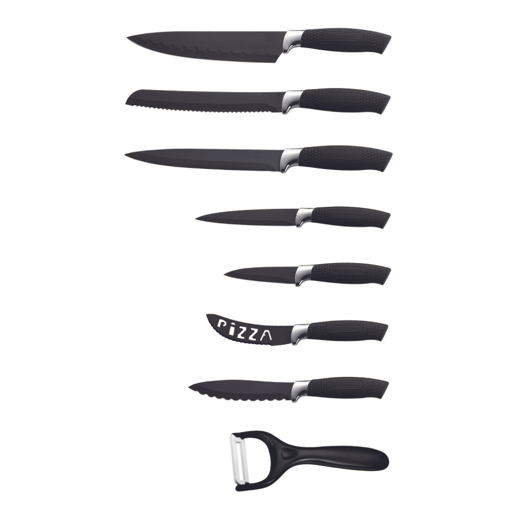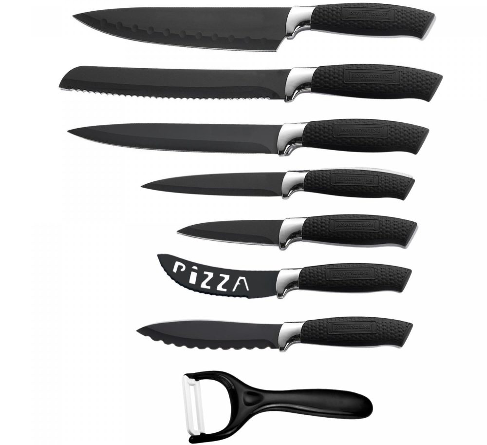 - Conjunto versátil de 7 peças: A linha Royalty RL-BLK7-W apresenta um conjunto completo de sete facas, incluindo uma faca de carne, uma faca de chef, uma faca de pão, duas facas de uso geral, uma faca de pizza, uma faca de queijo e um descascador. Esta coleção abrangente equipa você com a faca perfeita para cada tarefa de corte e fatiamento em sua cozinha.