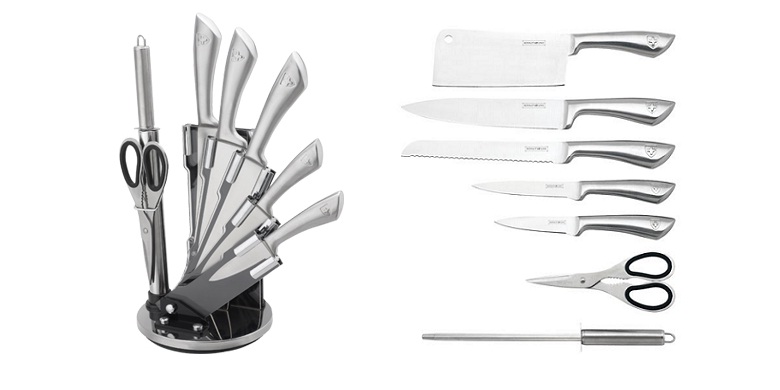 - Conjunto completo de 8 peças – Inclui um cutelo de 6,5″, uma faca de chef de 8″, uma faca de pão de 8″, uma faca utilitária de 5″, uma faca de descascar de 3,5″, um afiador de 7,25″, uma tesoura de 7,5″ e um suporte estiloso, cobrindo todas as suas necessidades de corte, picagem e fatiamento para várias tarefas culinárias.