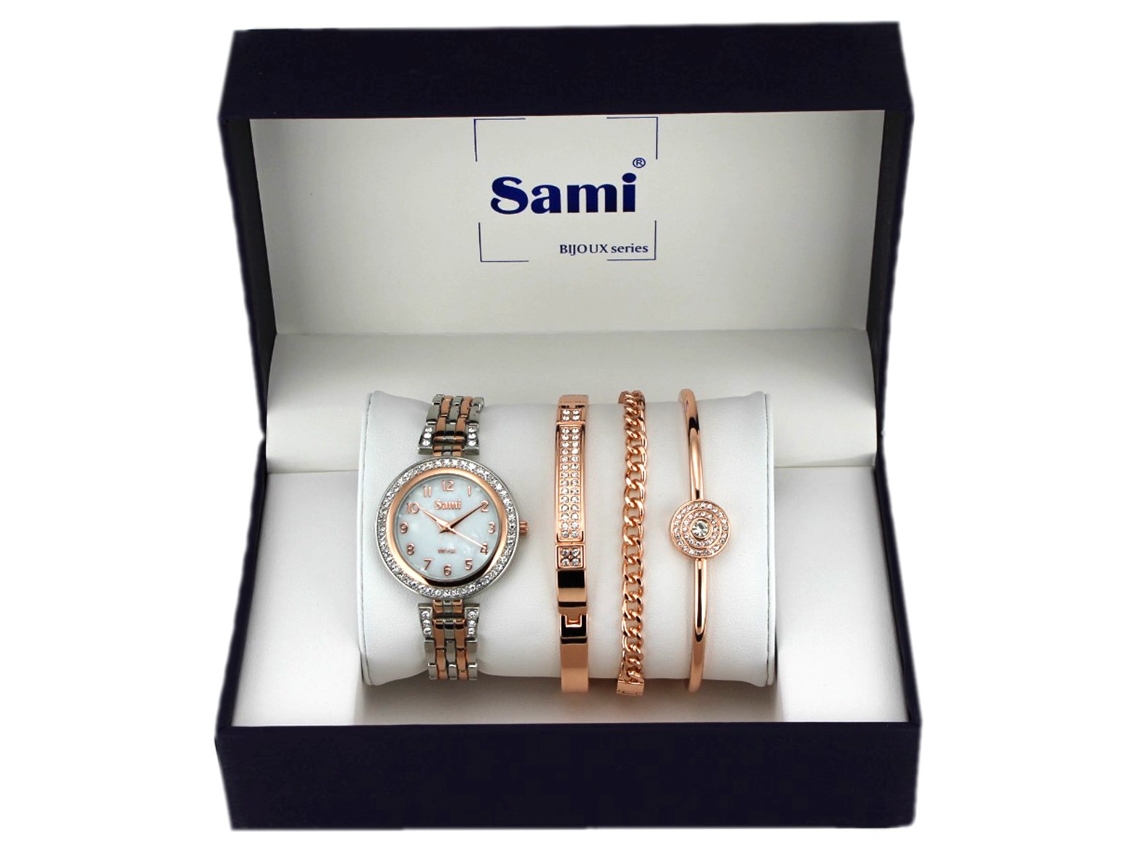 O presente conjunto da marca Sami® é composto por um relógio de pulso com bracelete e duas pulseiras que combinam entre si.