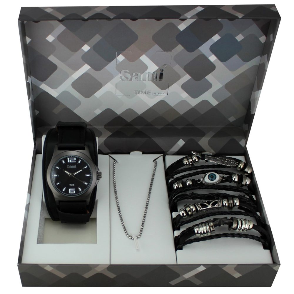 O presente conjunto da marca Sami® é composto por um relógio de pulso com corrente e cinco pulseiras que combinam entre si.
