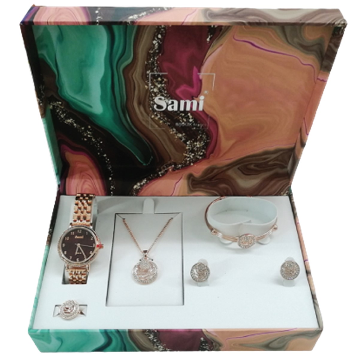 O conjunto presente da marca G&B Time é composto por um relógio de pulso, uma pulseira, um colar, um anel e um par de brincos.