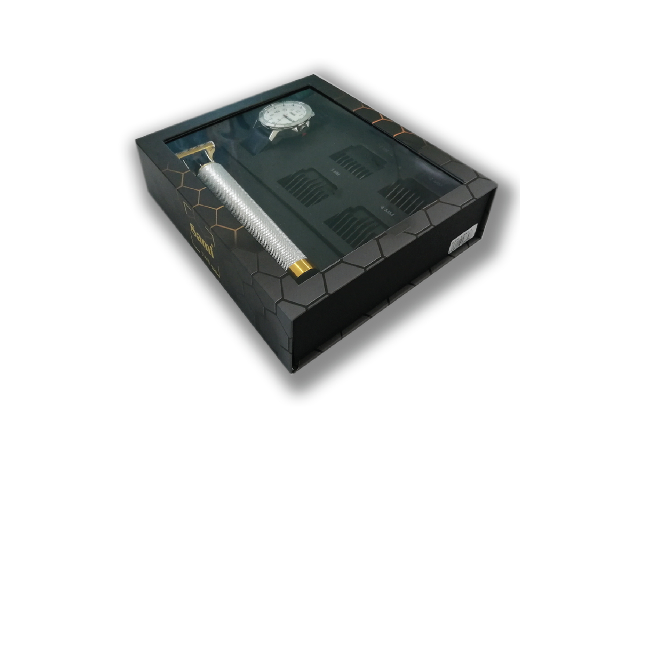 O conjunto presente da marca G&B Time é composto por um relógio de pulso com uma máquina de barbear e os respetivos pentes.