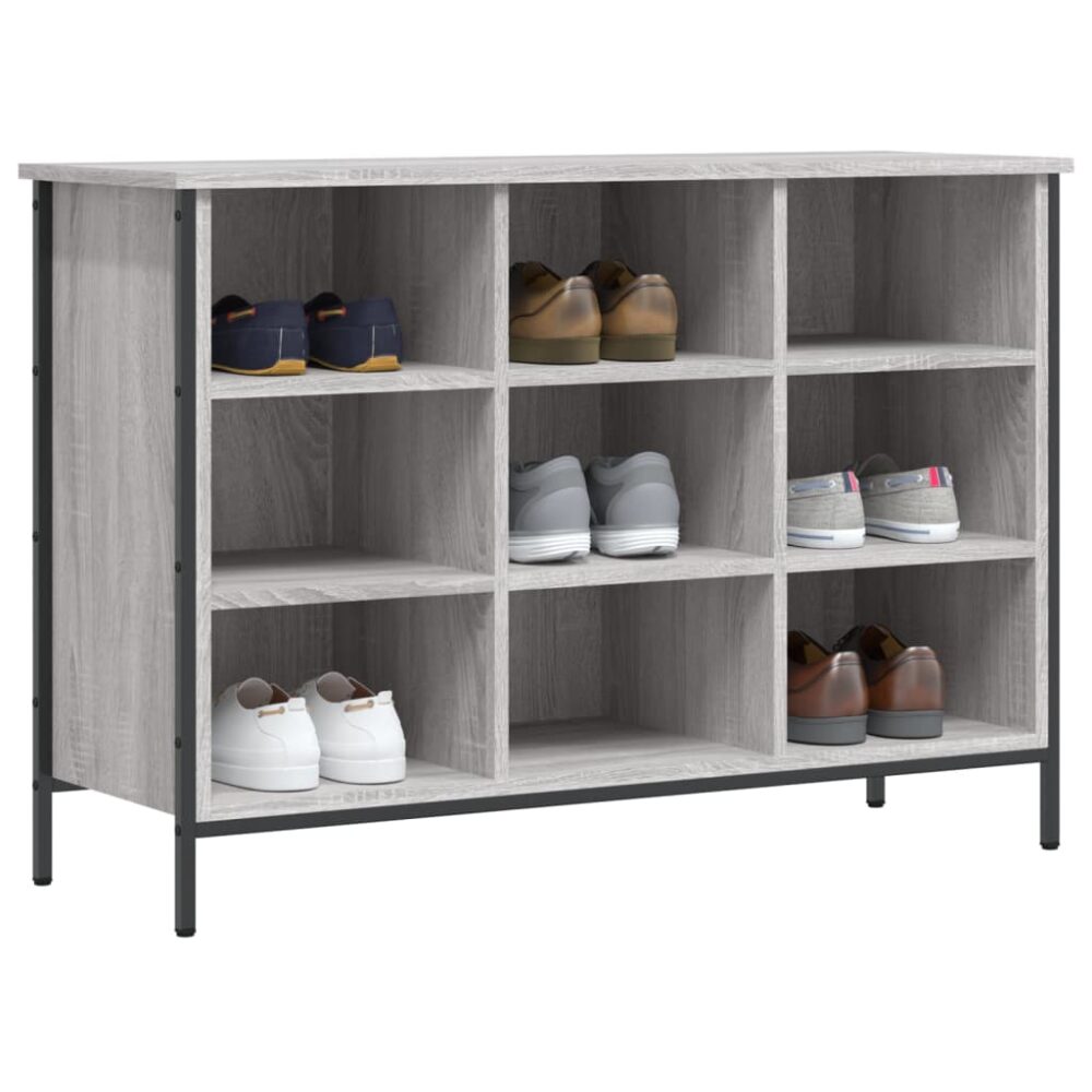 Com esta sapateira, mantenha o seu calçado longe do pó e arrumado para criar um ambiente organizado! Material robusto: os móveis feitos em derivados de madeira possuem uma qualidade excecional e oferecem uma superfície suave bem como força, estabilidade e resistência à humidade.Estrutura estável: os pés de aço revestido a pó desta sapateira acrescentam um estilo industrial e calmo ao seu interior, ao mesmo tempo que asseguram estabilidade.Amplo espaço de arrumação: esta sapateira apresenta 9 compartimentos, proporcionando um amplo espaço de arrumação para guardar todo o tipo de calçado.Função versátil: esta sapateira pode ser utilizada como arrumação e como banco sapateira. Pode calçar ou descalçar os seus sapatos facilmente ao sentar-se no banco sapateira, em vez de se encostar à parede. Atenção:Para evitar que o produto se vire, deve utilizar o dispositivo de fixação na parede fornecido.