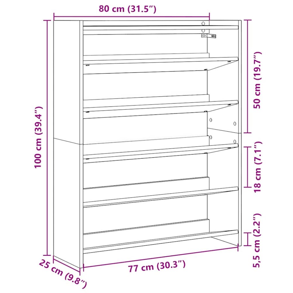 Mantenha o seu calçado arrumado e crie um ambiente organizado com esta elegante sapateira! Material estável e durável: os derivados de madeira são um material durável e estável com uma superfície lisa que é resistente à humidade, deformação e rachadelas, tornando-se uma escolha fiável para uma variedade de projetos.Amplo espaço de arrumação: a sapateira possui prateleiras, proporcionando um amplo espaço para a arrumação de sapatos. Com este prático organizador de sapatos, deixará de se aborrecer com os sapatos espalhados pelo chão.Tampo prático: a prateleira superior resistente da sapateira é ideal para exibir objetos decorativos, molduras de fotos ou armazenar algo como chaves ou carteiras que você possa precisar ao seu alcance.Design economizador de espaço: a sapateira fina foi projetada para se encaixar perfeitamente em pequenos espaços como entradas, corredores, salas de lama, etc.Fácil de cuidar: graças à sua superfície suave, a mesa é fácil de limpar com um pano húmido e requer menos manutenção.Atenção:Para evitar que tombe, este produto deve ser utilizado com o dispositivo de fixação na parede fornecido.
