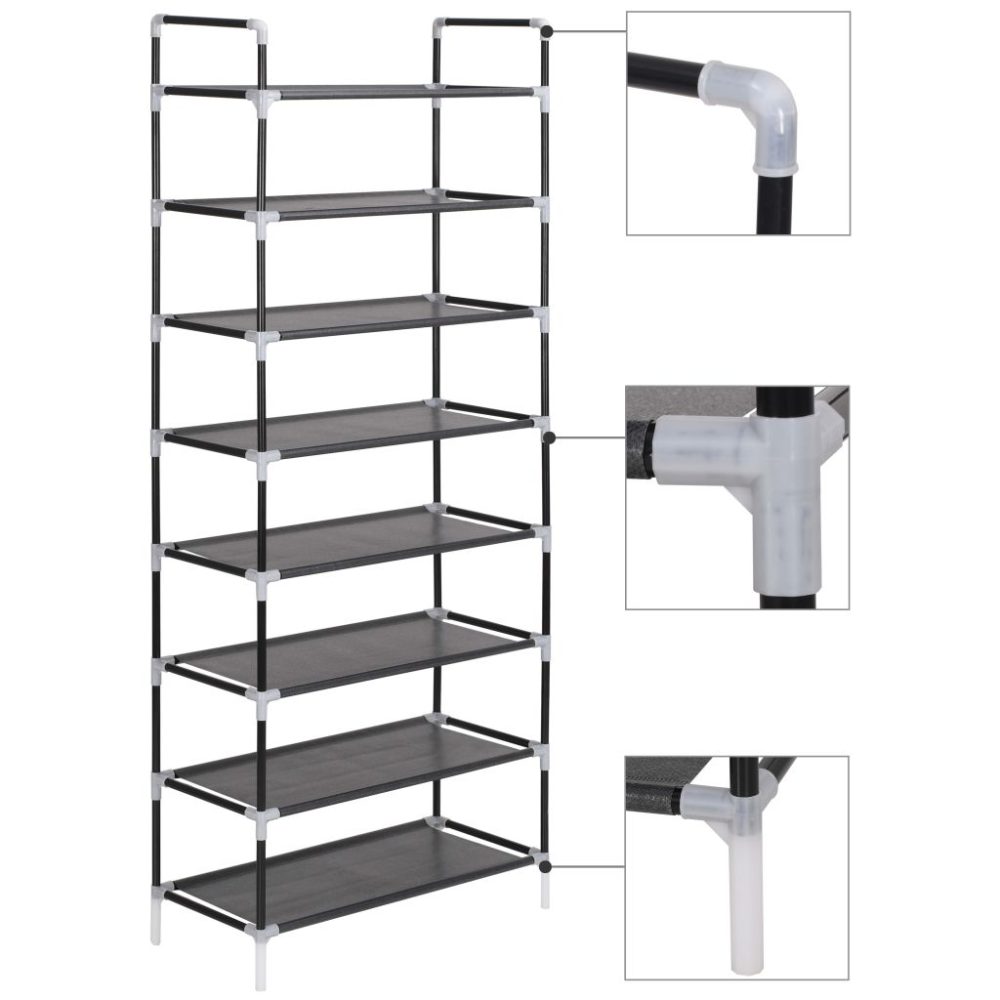 Possui uma estrutura em metal tubular, que é leve mas resistente, tornando a sapateira fácil de movimentar e bastante durável. Possui ainda oito prateleiras generosas feitas de tecido não tecido (TNT) ecológico e um amplo espaço para manter o seu calçado organizado e arrumado.