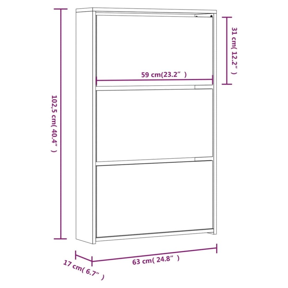 Esta sapateira de 3 divisórias, com um design moderno e elegante, é uma excelente peça de mobiliário para arrumar o seu calçado de uma forma organizada. É adequada para a entrada, corredor, sala de estar, quarto e outros lugares onde a queira colocar. Material durável: os derivados de madeira possuem uma qualidade excecional e oferecem uma superfície suave bem como força, estabilidade e resistência à humidade.Amplo espaço de arrumação: esta sapateira possui 3 gavetas e cada uma delas pode acomodar entre 3 e 4 pares de sapatos.Gaveta de puxar: concebido com uma gaveta de puxar, este armário para arrumar calçado é fácil de abrir e de fechar. Nota:Cada produto é fornecido com um manual de instruções na caixa para facilitar a montagem. Atenção:Para evitar que o produto se vire, deve utilizar o dispositivo de fixação na parede fornecido.