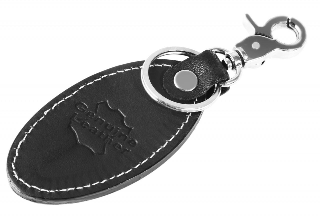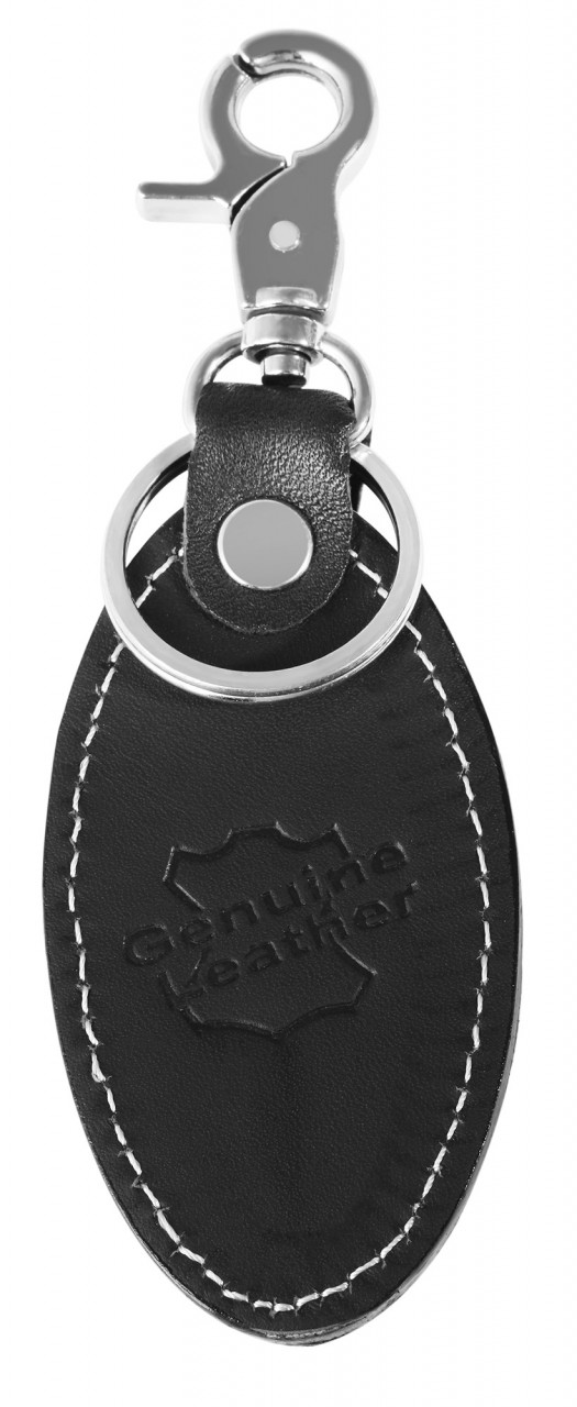 O porta-chaves oval é feito de couro genuíno e está disponível em preto e marrom. O pingente simples é decorado com uma costura decorativa branca. Para a fixação são utilizados um mosquetão resistente e um porta-chaves com diâmetro de 25 mm. Isso oferece espaço suficiente para várias chaves. O pingente também valoriza qualquer chaveiro e é um lindo acessório ideal para presentear seus entes queridos. O tamanho do porta-chaves é 85 mm de comprimento, 46 mm de largura e 7 mm de espessura.