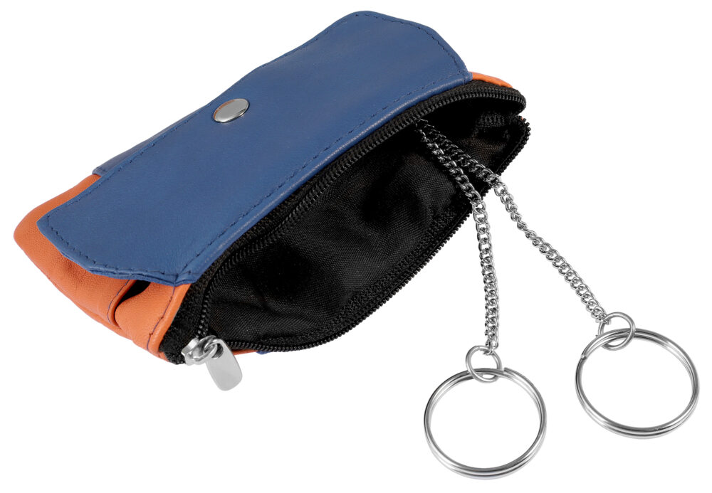 - O porta-chaves tem um compartimento interior grande, fechado com um fecho de correr, e um pequeno compartimento exterior com um botão de pressão.