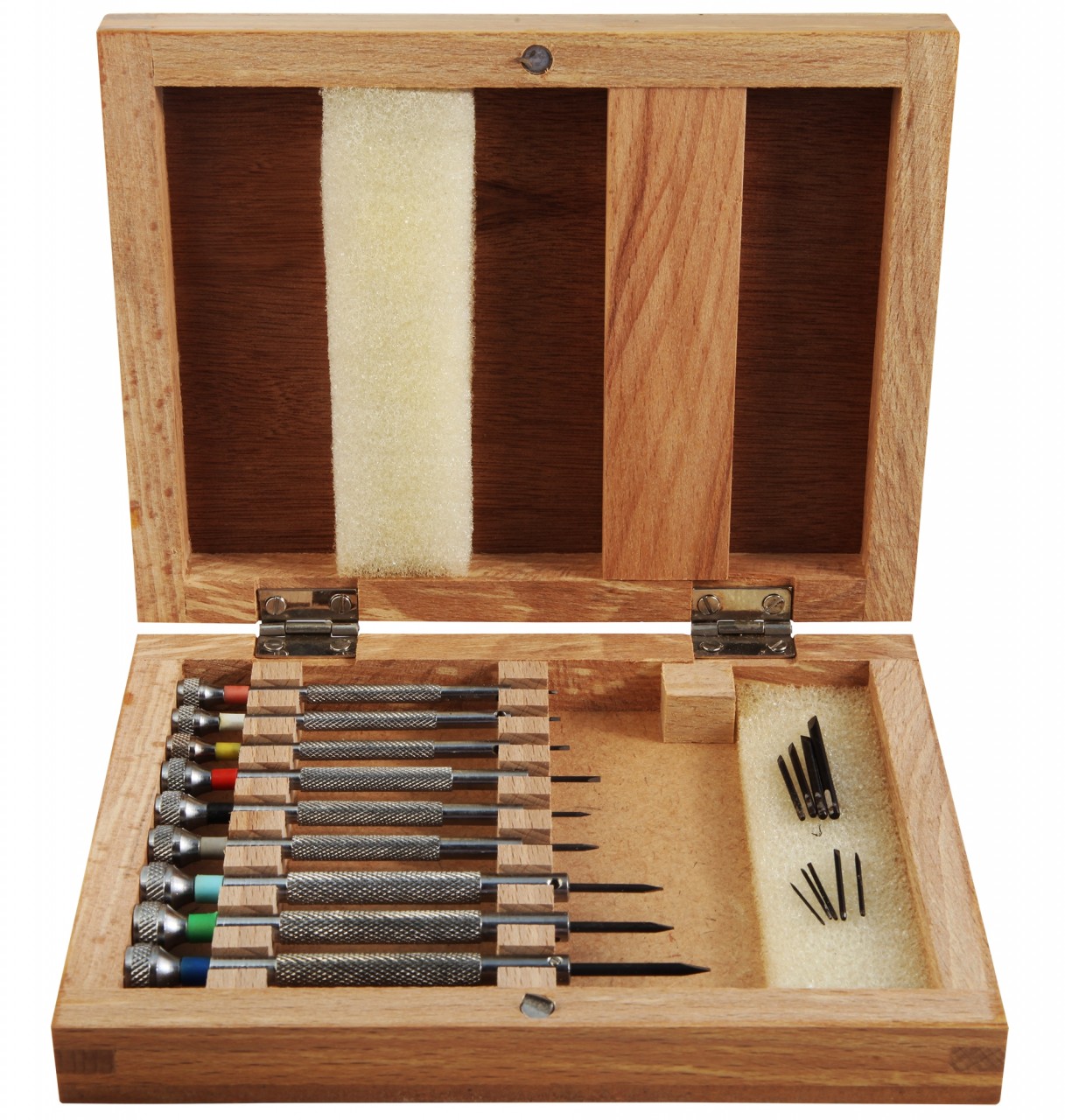 O conjunto de chaves de fendas é composto por nove chaves de fendas sortidas, que são fornecidas numa caixa de madeira com fecho magnético. As chaves de fendas estão disponíveis nas espessuras de 2,5 mm, 2,0 mm, 1,8 mm, 1,5 mm, 1,3 mm, 1,1 mm, 1,0 mm, 0,9 mm e 0,7 mm. Também está incluída uma lâmina sobresselente para cada chave de fendas. As chaves de fendas são indispensáveis na oficina de um relojoeiro. São necessárias para abrir caixas de relógios, encurtar correias de relógios e para reparações no interior e no exterior do movimento. A caixa de madeira mede 16,1 cm de largura, 12,5 cm de comprimento e 3,2 cm de altura.