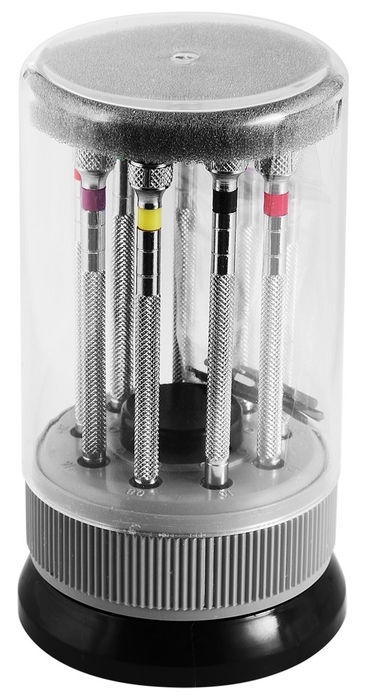 O conjunto de chaves de fenda contém 7 chaves de fenda nos tamanhos 0,8 cm, 1,0 cm, 1,2 cm, 1,4 cm, 1,6 cm, 1,8 cm e 2,0 cm. Estes têm um comprimento de 8,8 cm. Duas chaves de fenda Phillips nos tamanhos 1,6 cm e 1,8 cm também estão incluídas. Estes têm um comprimento de 8,9 cm. Uma lâmina de reposição está incluída no conjunto para cada uma dessas chaves de fenda. Todas as chaves de fenda são colocadas em uma base giratória. É feito de plástico e consiste em uma base preta e uma base giratória cinza. Se necessário, também pode ser coberto com uma tampa de plástico transparente. As chaves de fenda estão marcadas em cores diferentes. Eles são particularmente adequados para consertar relógios e outras peças pequenas.