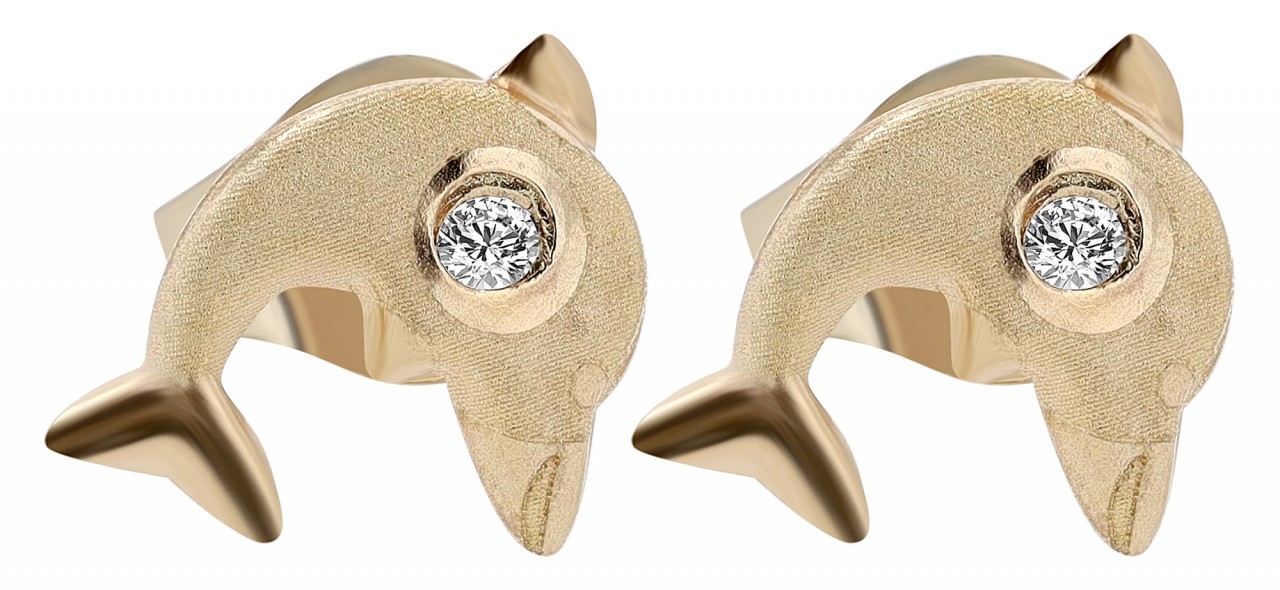 Brincos mágicos “Scipp” feitos de ouro 8k. Estes brincos de um lindo golfinho, foscos e decorados com zircónias, foram especialmente desenhados para as meninas. O fecho de encaixe seguro fornece suporte e facilita a colocação e remoção dos brincos. No mundo da joalheria, o golfinho é símbolo, entre outras coisas, da alegria de viver e da despreocupação, qualidades que toda menina deveria ter dentro de si. Estes brincos “Scipp” são um presente ideal para aniversários, ocasiões especiais ou como uma surpresa amorosa.