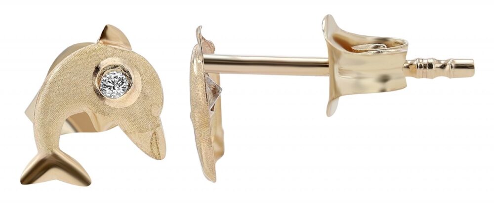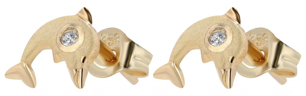 Brincos mágicos “Scipp” feitos de ouro 8k. Estes brincos de um lindo golfinho, foscos e decorados com zircónias, foram especialmente desenhados para as meninas. O fecho de encaixe seguro fornece suporte e facilita a colocação e remoção dos brincos. No mundo da joalheria, o golfinho é símbolo, entre outras coisas, da alegria de viver e da despreocupação, qualidades que toda menina deveria ter dentro de si. Estes brincos “Scipp” são um presente ideal para aniversários, ocasiões especiais ou como uma surpresa amorosa.
