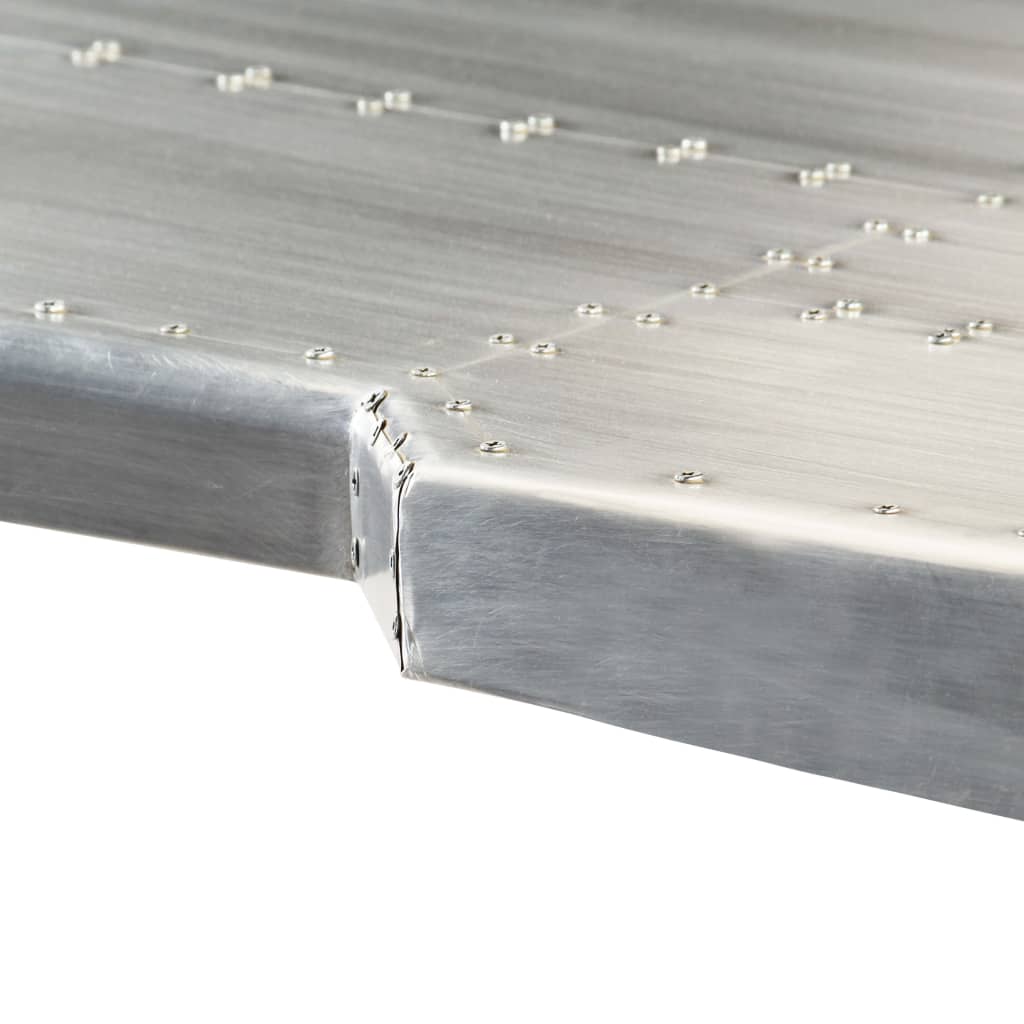 A secretária estilo aeronave é feita em madeira de mangueira maciça e a sua superfície foi chapeada com remendos de painéis em alumínio polido, acentuada com parafusos de aço expostos, tornando-a extremamente durável. As pernas de aço em cor de latão e os rebites padronizados atribuem uma aparência industrial à mesa aviador. Possui um tampo grande que oferece um amplo espaço para colocar os seus documentos, papéis, livros ou outros pertences.