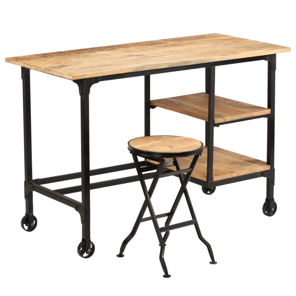 A mesa de computador e o banco são feitos em madeira de mangueira maciça que recebeu um belo acabamento polido e envernizado para lhe atribuir um aspeto requintado. Os belos grãos da madeira tornam cada peça de mobiliário única e ligeiramente diferente das restantes. Esta secretária possui duas prateleiras, que fornecem um amplo espaço para armazenar e organizar os seus ficheiros, papéis, documentos e outros pertences particulares. As rodas integradas facilitam a deslocação da mesa. A estrutura em aço revestido a pó contribui para a estabilidade da mesa e do banco, bem como para o seu estilo industrial. O banco pode ser dobrado para um fácil transporte e armazenamento. A montagem é fácil. A entrega inclui uma mesa e um banco dobrável.
