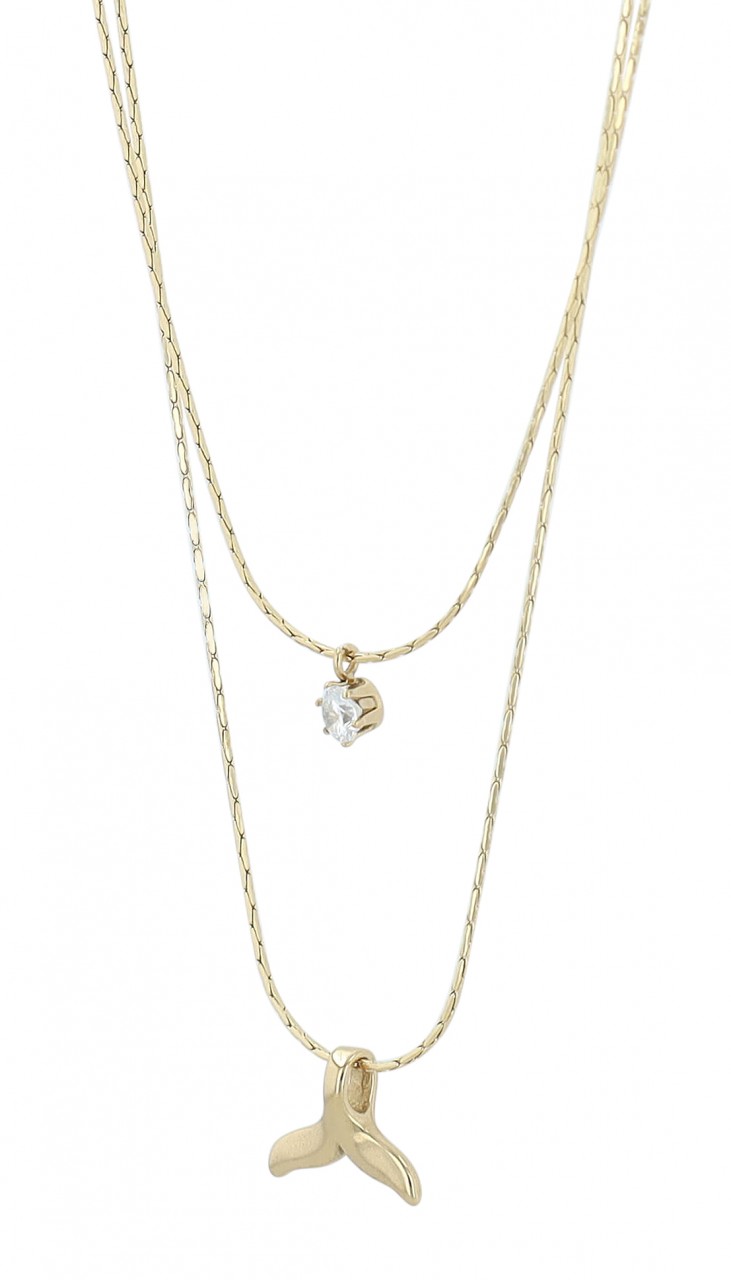 Crie toques de estilo com esta elegante corrente de aço inoxidável de camada dupla com acabamento dourado de alta qualidade. A corrente fina com espessura de 0,8 mm é composta por duas fileiras com comprimentos de 38 cm e 41,5 cm, complementadas por uma extensão prática de 5 cm para opções de uso individual. O pingente de barbatana de baleia em filigrana simboliza liberdade e força interior e é realçado por uma pedra de zircônia brilhante. Este colar não é apenas um chamariz elegante, mas também uma peça de joia significativa – perfeita para qualquer ocasião.