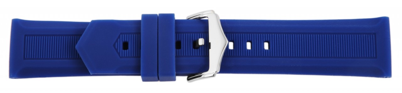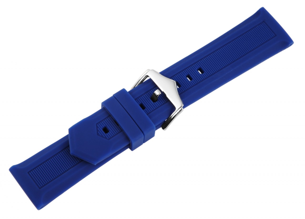 A pulseira de silicone azul está disponível em larguras de 12 mm, 14 mm, 16 mm, 18 mm, 20 mm, 22 mm, 24 mm, 26 mm e 28 mm. Possui superfície lisa perfurada no meio com finas listras horizontais. A espessura do material é de 5 mm. A pulseira de substituição tem um comprimento total entre 20,5 cm e 21,5 cm. O comprimento total depende do terminal da pulseira. A pulseira de silicone pode ser aberta e fechada com uma fivela de aço inoxidável prateada. A alça do fecho é até 4 mm mais estreita do que a alça da pulseira porque a alça é estreitamente estreita. A pulseira de silicone oferece alto nível de conforto graças ao material macio.