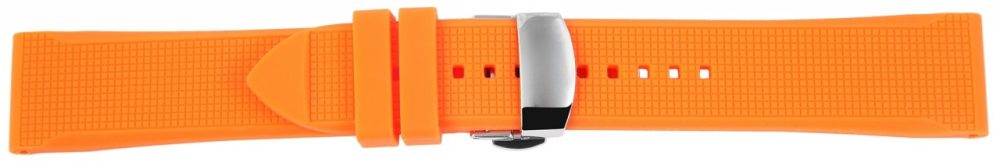 A pulseira de silicone laranja está disponível em larguras de 18 mm, 20 mm e 22 mm. Possui uma superfície lisa perfurada com um padrão xadrez fino e pouco visível. A espessura do material é de 4 mm. A pulseira de substituição tem um comprimento total entre 19 cm e 21 cm. O comprimento total depende do terminal da pulseira. A pulseira de silicone pode ser aberta e fechada usando um fecho dobrável tipo borboleta prateado feito de aço inoxidável. A alça do fecho é 2 mm mais estreita que a alça da pulseira porque a pulseira é cônica. A pulseira de silicone oferece alto nível de conforto graças ao material macio.