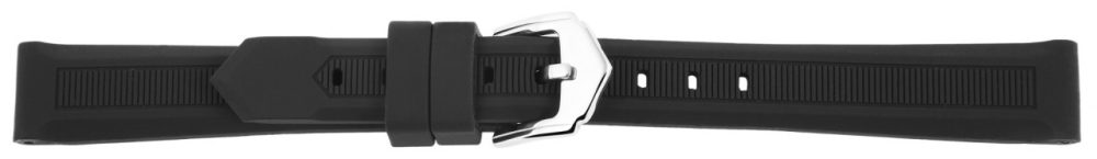 A pulseira de silicone preta está disponível em larguras de 12 mm, 14 mm, 16 mm, 18 mm, 20 mm, 22 mm, 24 mm, 26 mm e 28 mm. Possui superfície lisa perfurada no meio com finas listras horizontais. A espessura do material é de 4 mm. A pulseira de substituição tem um comprimento total entre 20,5 cm e 21,5 cm. O comprimento total depende do terminal da pulseira. A pulseira de silicone pode ser aberta e fechada com uma fivela de aço inoxidável prateada. A alça do fecho é até 4 mm mais estreita do que a alça da pulseira porque a alça é estreitamente estreita. A pulseira de silicone oferece alto nível de conforto graças ao material macio.