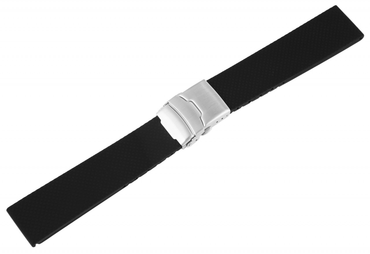 A pulseira de silicone preta está disponível em larguras de 20 mm, 22 mm e 24 mm. Possui uma superfície lisa perfurada com um padrão de diamante fino e pouco visível. A espessura do material é de 3 mm. A pulseira de substituição tem um comprimento total entre 19 cm e 21 cm. O comprimento total depende do terminal da pulseira. A pulseira de silicone pode ser aberta e fechada usando um fecho dobrável em aço inoxidável prateado. A alça do fecho é 2 mm mais estreita que a alça da pulseira porque a pulseira é cônica. É ajustável a qualquer pulso. A pulseira de silicone oferece alto nível de conforto graças ao material macio.