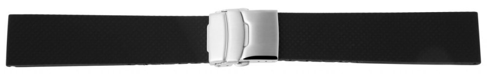 A pulseira de silicone preta está disponível em larguras de 20 mm, 22 mm e 24 mm. Possui uma superfície lisa perfurada com um padrão de diamante fino e pouco visível. A espessura do material é de 3 mm. A pulseira de substituição tem um comprimento total entre 19 cm e 21 cm. O comprimento total depende do terminal da pulseira. A pulseira de silicone pode ser aberta e fechada usando um fecho dobrável em aço inoxidável prateado. A alça do fecho é 2 mm mais estreita que a alça da pulseira porque a pulseira é cônica. É ajustável a qualquer pulso. A pulseira de silicone oferece alto nível de conforto graças ao material macio.