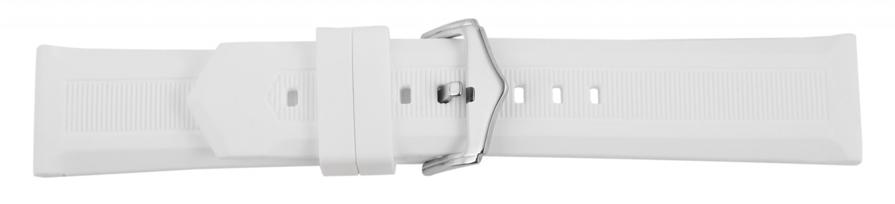 A pulseira de silicone branca está disponível em larguras de 12 mm, 14 mm, 16 mm, 18 mm, 20 mm, 22 mm, 24 mm, 26 mm e 28 mm. Possui superfície lisa perfurada no meio com finas listras horizontais. A espessura do material é de 5 mm. A pulseira de substituição tem um comprimento total entre 20,5 cm e 21,5 cm. O comprimento total depende do terminal da pulseira. A pulseira de silicone pode ser aberta e fechada com uma fivela de aço inoxidável prateada. A alça do fecho é até 4 mm mais estreita do que a alça da pulseira porque a alça é estreitamente estreita. A pulseira de silicone oferece alto nível de conforto graças ao material macio.