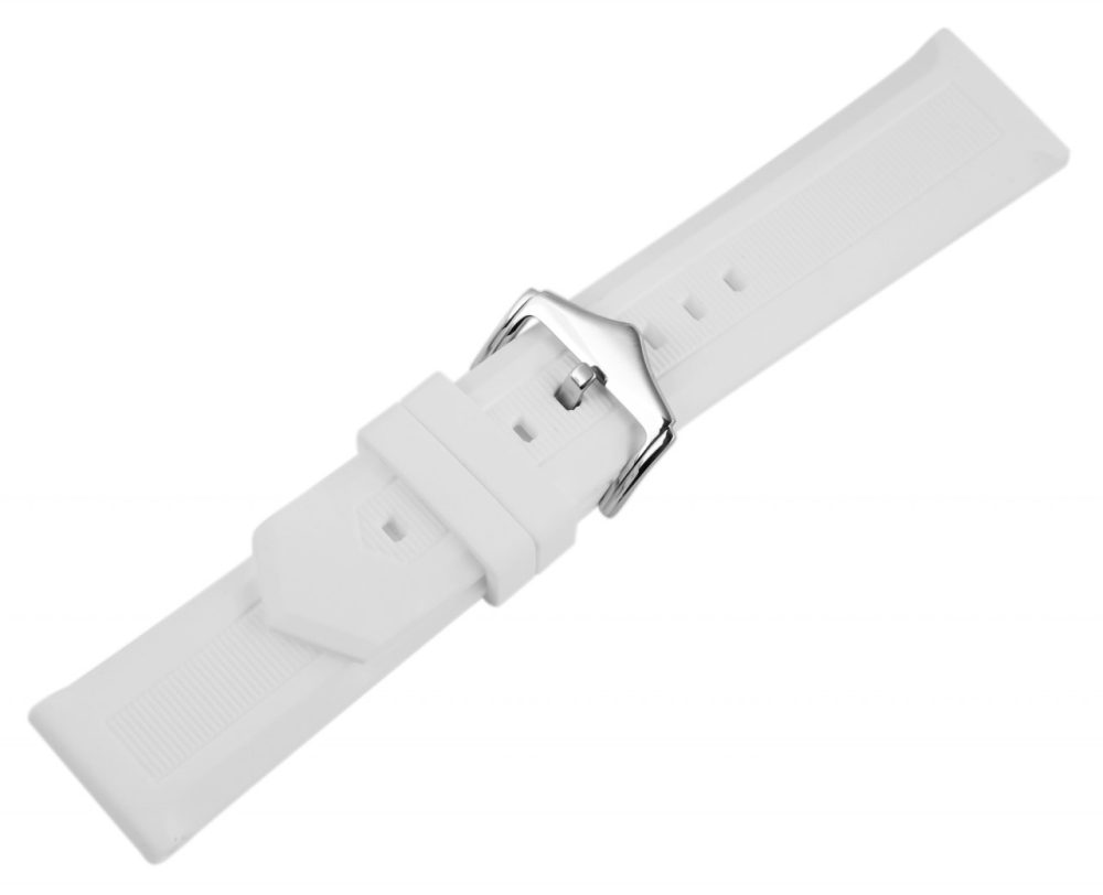 A pulseira de silicone branca está disponível em larguras de 12 mm, 14 mm, 16 mm, 18 mm, 20 mm, 22 mm, 24 mm, 26 mm e 28 mm. Possui superfície lisa perfurada no meio com finas listras horizontais. A espessura do material é de 5 mm. A pulseira de substituição tem um comprimento total entre 20,5 cm e 21,5 cm. O comprimento total depende do terminal da pulseira. A pulseira de silicone pode ser aberta e fechada com uma fivela de aço inoxidável prateada. A alça do fecho é até 4 mm mais estreita do que a alça da pulseira porque a alça é estreitamente estreita. A pulseira de silicone oferece alto nível de conforto graças ao material macio.