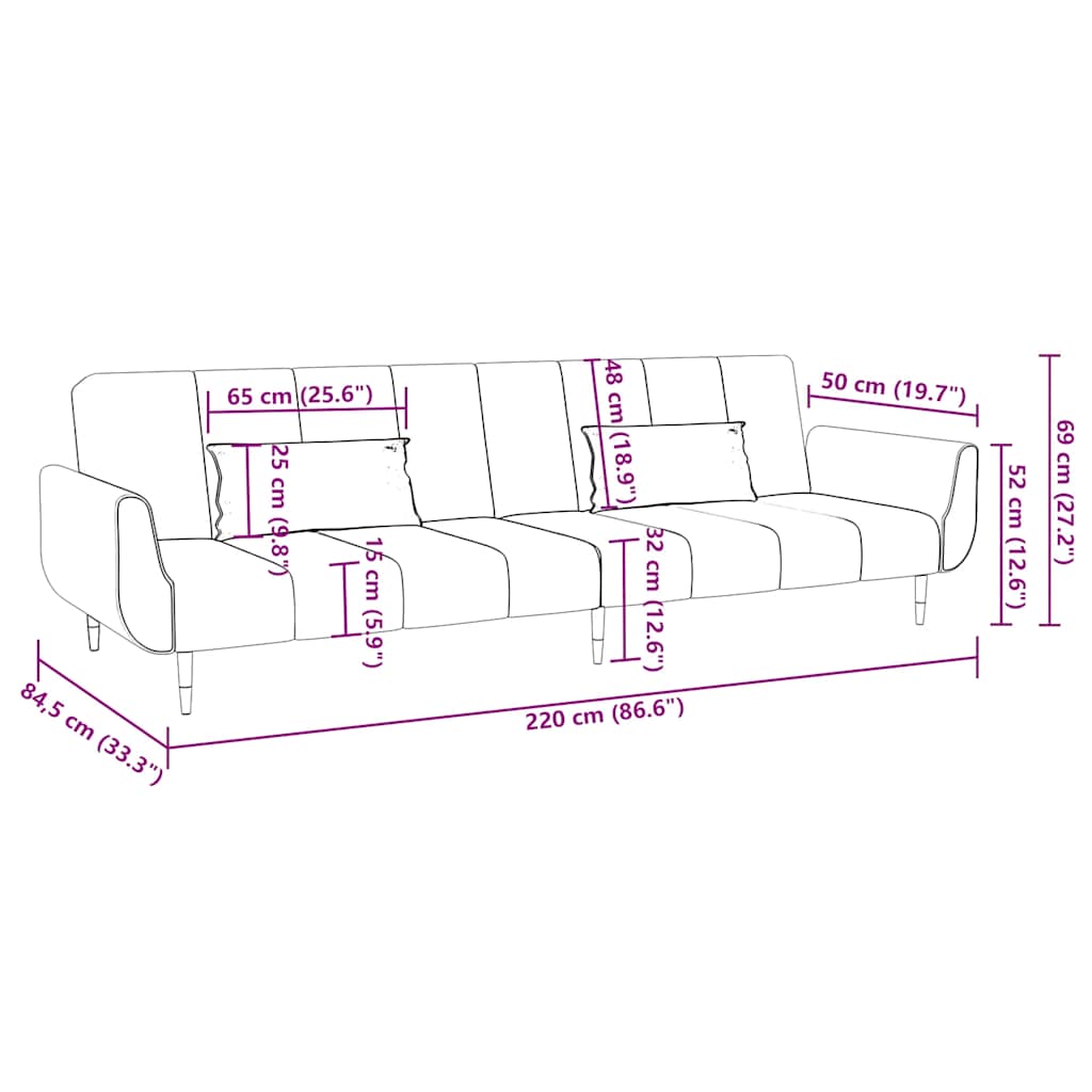 Este sofá-cama possui um design conversível. Assim, pode escolher entre uma posição sentada, encostada ou deitada, de acordo com a sua preferência e necessidades de conforto. É a peça de mobília ideal se precisar de espaço extra para acomodar amigos e convidados durante a noite. Material suave e confortável: o tecido de veludo apresenta uma textura delicada e é suave e confortável ao toque.Encosto ajustável: pode empurrar os dois almofadões separados para trás parcialmente ou completamente para baixo, para criar um local ideal para uma soneca ou uma cama de solteiro.Robusto e estável: a estrutura de madeira e as pernas de metal do sofá-cama asseguram resistência e estabilidade.Duas almofadas para conforto : estão incluídas duas almofadas para o seu conforto. Máximo de 110 kg por assento. Ter em atenção o risco de fogos abertos e outras fontes de calor forte nas proximidades do produto.