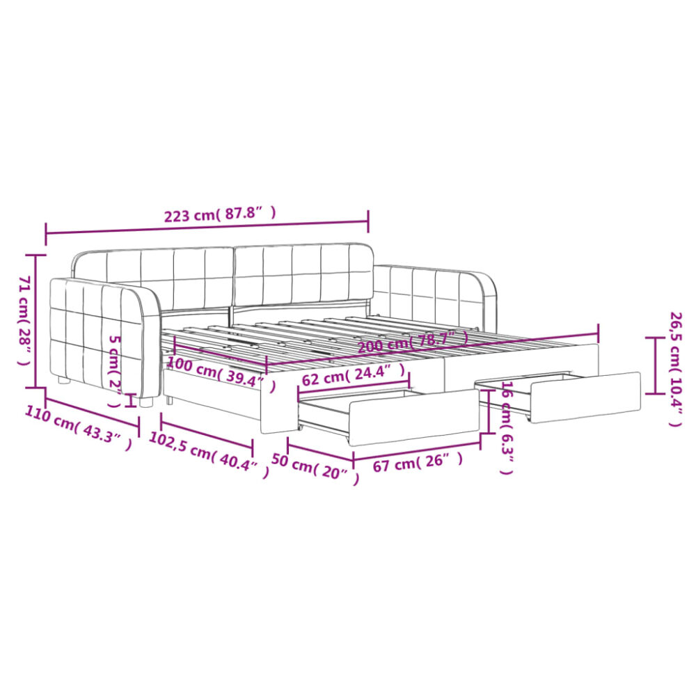 Este sofá-cama 2 em 1 com gavetão, que pode ser utilizado como um sofá ou como uma cama, é um complemento prático e atraente para a sua sala de estar ou quarto. Sofá-cama versátil: o sofá-cama funciona como um sofá durante o dia e converte-se facilmente numa cama de casal à noite puxando simplesmente o gavetão. Proporciona assim uma solução conveniente para acolher hóspedes e maximizar o espaço. Amplo espaço de arrumação: esta cama de hóspedes possui duas gavetas com rodas que fornecem um espaço amplo para guardar a sua roupa, meias, brinquedos, almofadões, etc.Veludo macio e construção sólida: este sofá-cama possui uma estrutura resistente feita de madeira e metal e foi estofado com um veludo macio e confortável. Útil saber:Os colchões não estão incluídos nesta cama. Oferecemos uma variada seleção de colchões. Pode consultar a nossa loja para encontrar os colchões correspondentes.