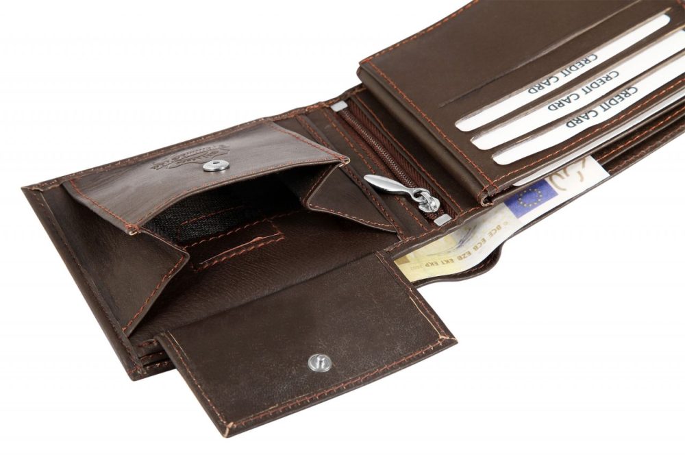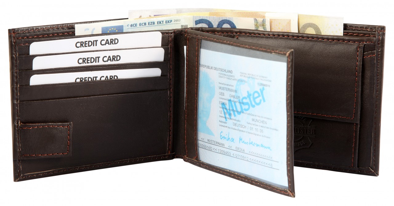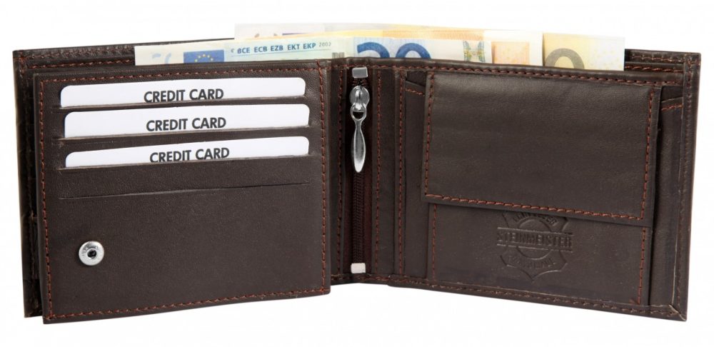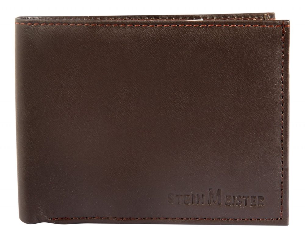 A carteira masculina da marca Steinmeister foi confeccionada em formato paisagem em couro genuíno. Tem comprimento de 9,2 cm, largura de 12,4 cm e espessura do material de 2,5 cm quando não preenchido. A bolsa impressiona pelo design simples e pela capacidade de armazenar documentos importantes. Graças à confortável divisão, possui 2 compartimentos para notas, 1 compartimento para moedas com compartimento para ficha de compras, 8 compartimentos para cartões de crédito, 1 compartimento transparente para identificação, 4 bolsos deslizantes e 1 compartimento com zíper na área interna. A carteira é um ótimo acessório para ele e é ideal como presente.