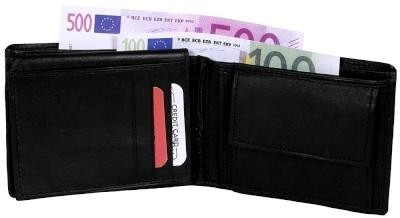 Carteira masculina SteinMeister feita de couro genuíno. A carteira paisagem tem 12 cm de largura e 9 cm de altura. A cor é preta. Possui 2 compartimentos para notas, um compartimento para trocos, 11 compartimentos para cartões de crédito e um compartimento transparente para identificação.