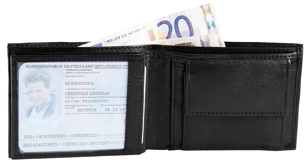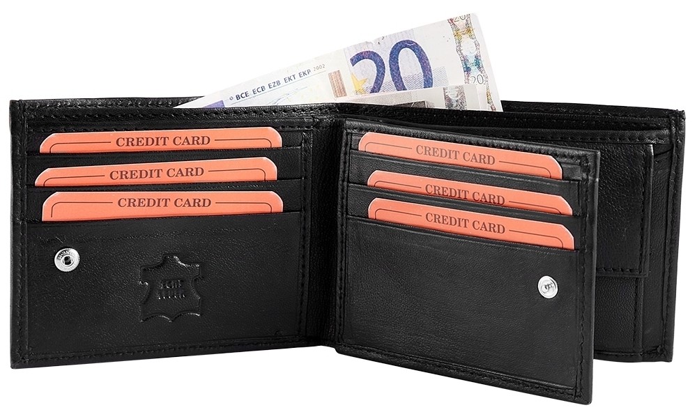 Carteira masculina feita de couro genuíno. A carteira paisagem tem 9 cm de largura e 12 cm de altura. A cor é. Possui 2 compartimentos para notas, um compartimento para moedas, 8 compartimentos para cartões de crédito e um compartimento transparente para identificação.