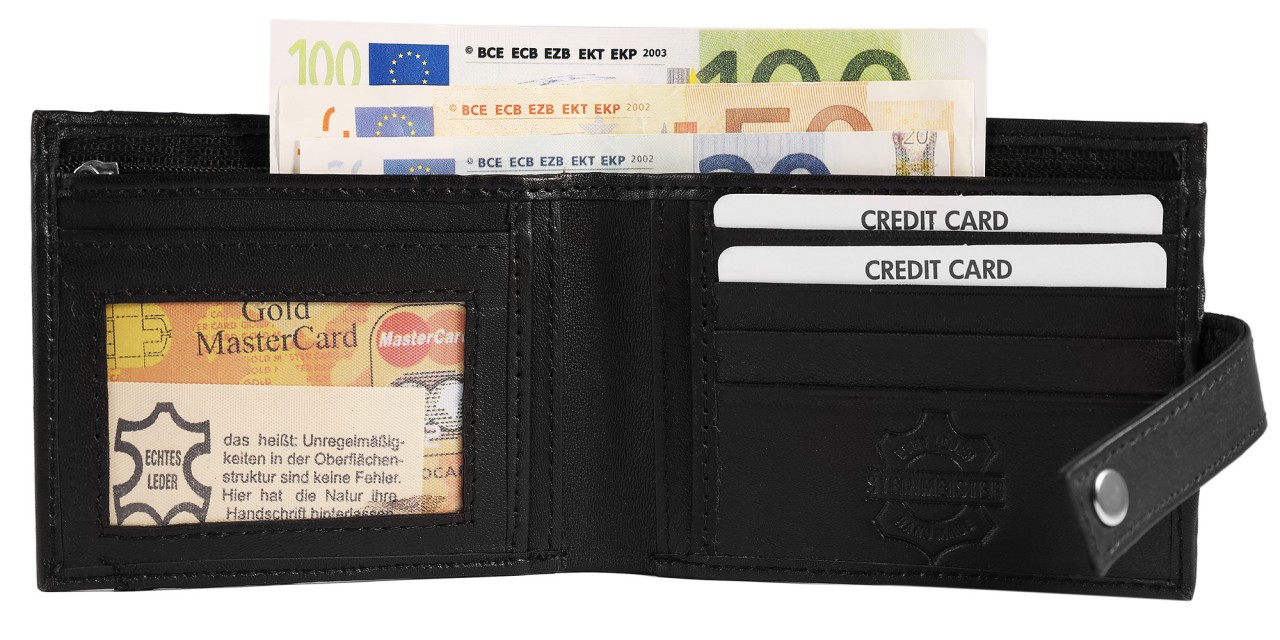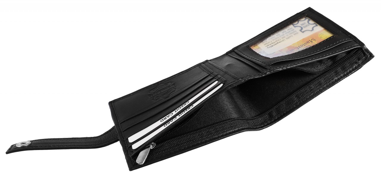 A carteira tem 1 compartimento para notas, 1 compartimento para moedas com zíper no qual as notas também podem ser armazenadas, 9 compartimentos para cartões de crédito, 1 compartimento para cartão de identificação e 5 bolsos, todos com um tamanho total de C 9,2 cm × L 11,4 cm, com uma profundidade de 2,2 cm.