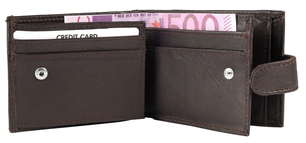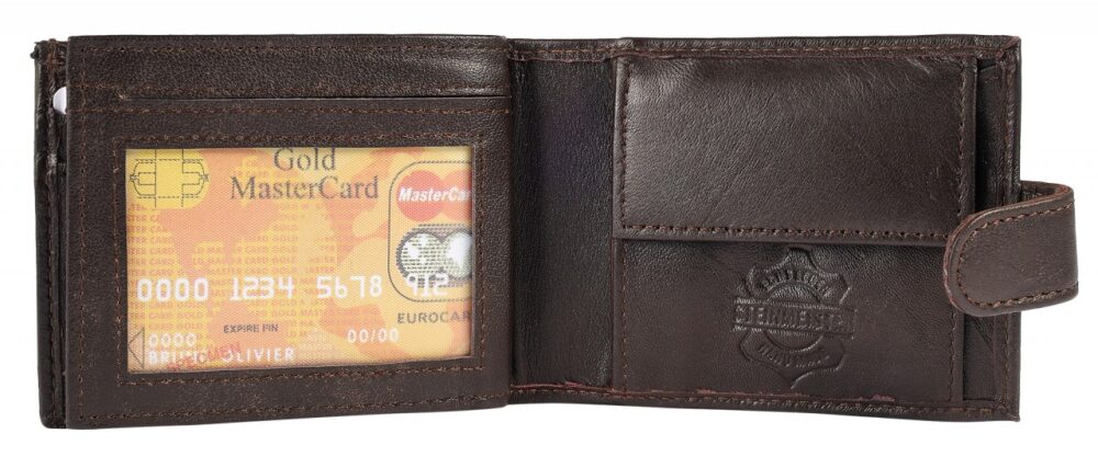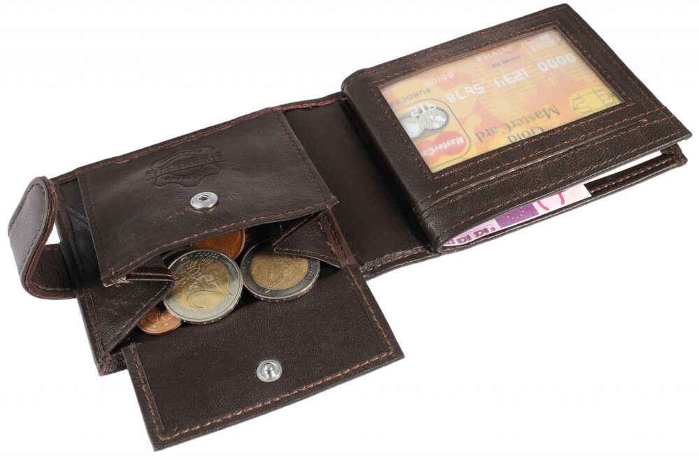 Couro macio com poros finos, toque agradável e design simples se unem nesta carteira masculina minimalista da marca Steinmeister. Apesar do seu design minimalista, a carteira bem equipada tem 2 compartimentos para notas, 1 compartimento para moedas, 3 compartimentos para cartões de crédito, 1 compartimento para cartão de identificação e 2 bolsos, todos com um tamanho total de C 8 cm × L 10,5 cm, com uma profundidade de 2 cm. Uma ótima companheira diária para ele, na qual documentos importantes e dinheiro podem ser armazenados com segurança atrás de um fecho de pressão.