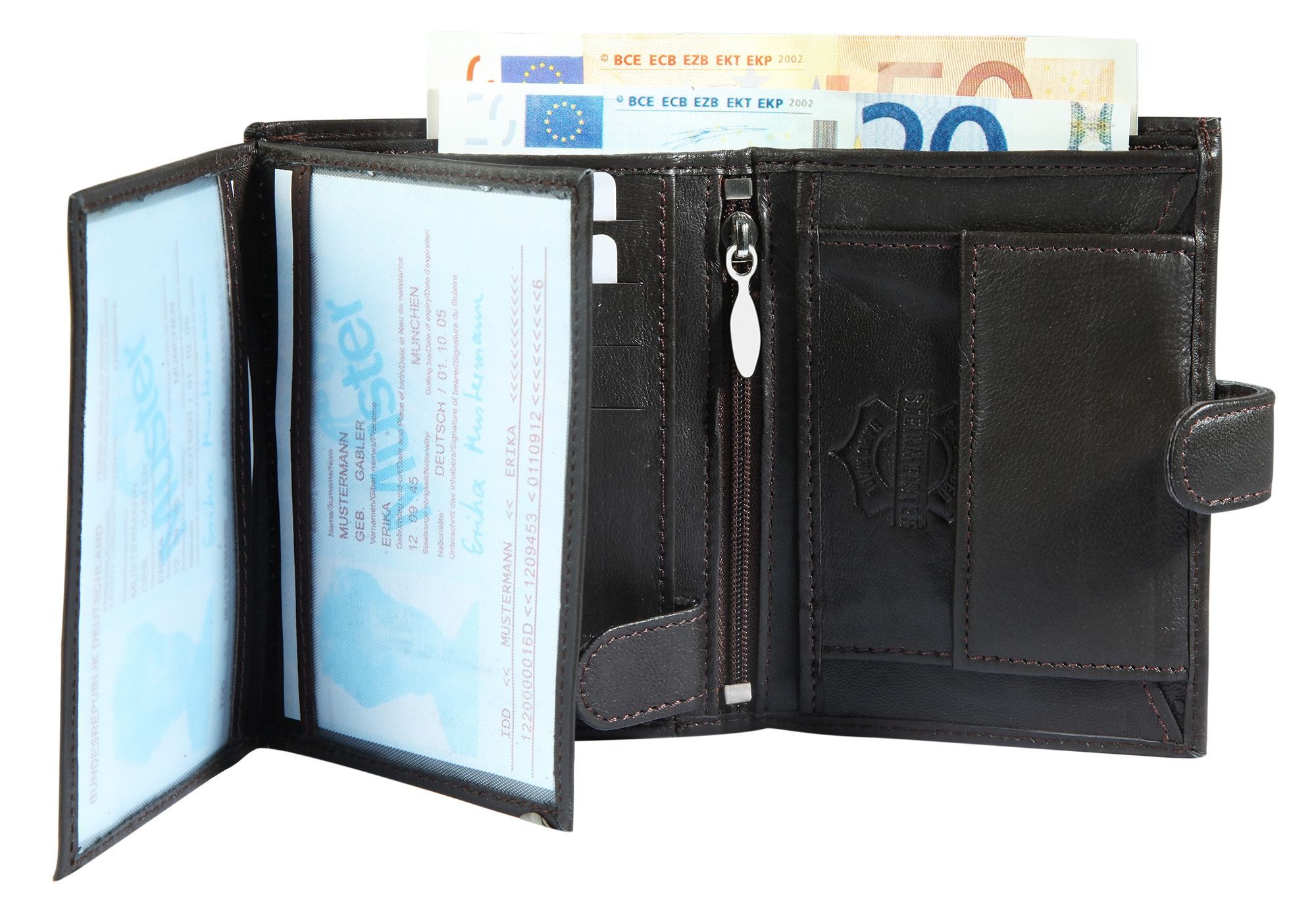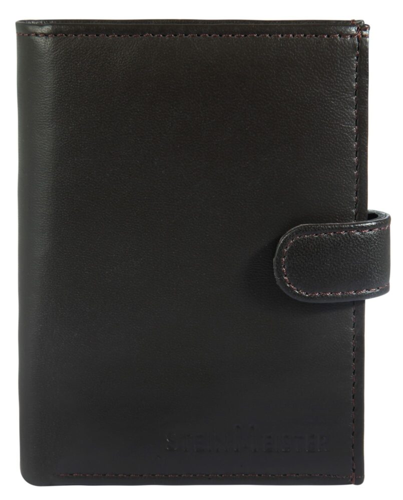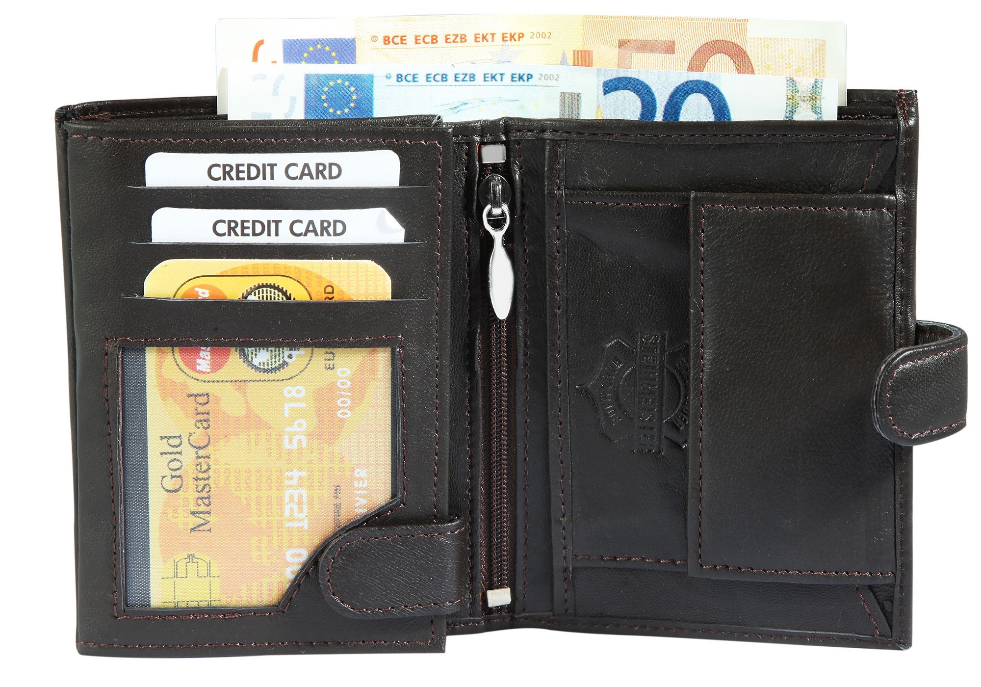 - A carteira pode ser aberta e fechada com um fecho de pressão, e as ranhuras para cartões de crédito e os compartimentos para cartões de identificação são fechados com um fecho de pressão.