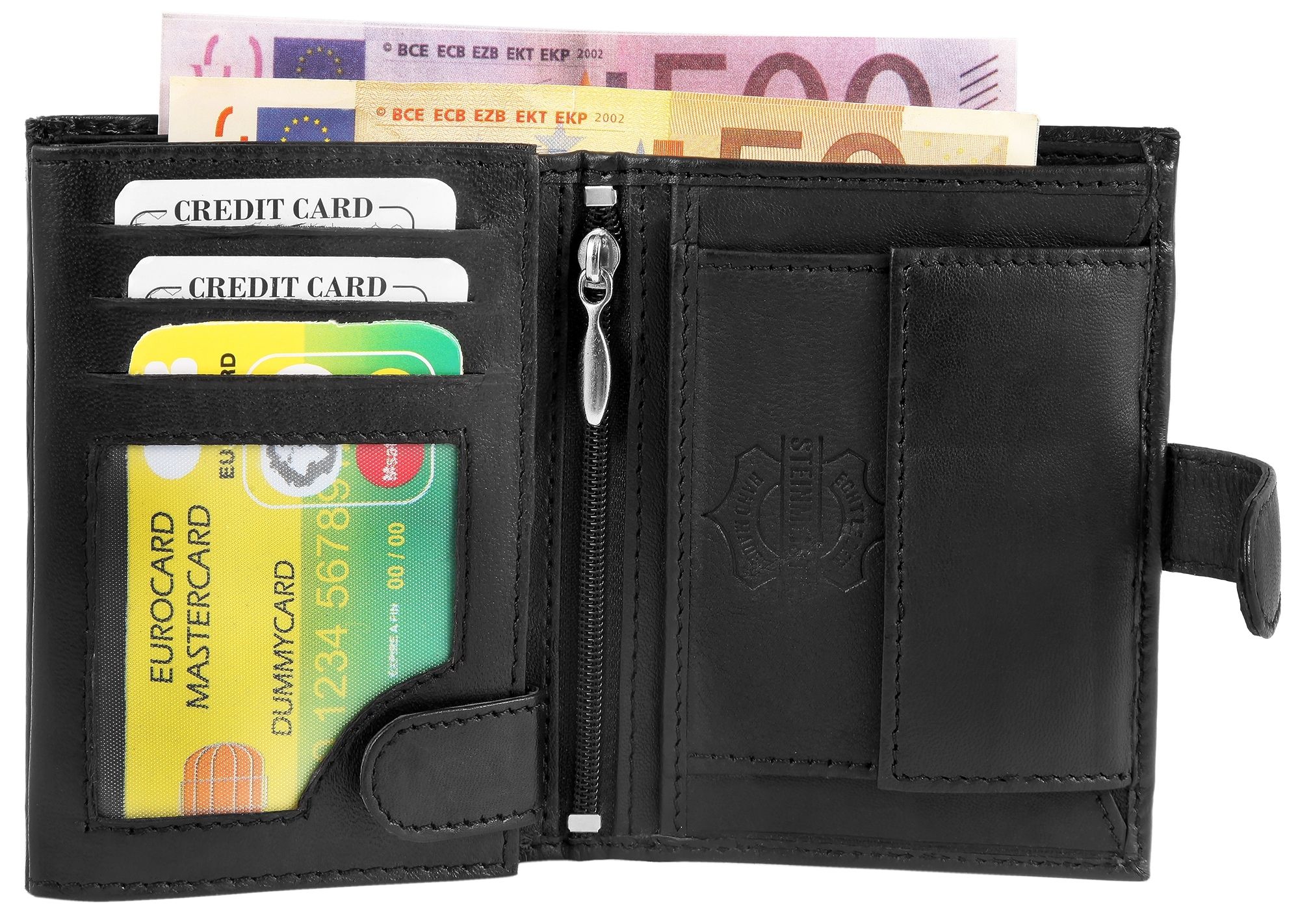 - A carteira pode ser aberta e fechada com um fecho de pressão, e as ranhuras para cartões de crédito e os compartimentos para cartões de identificação são fechados com um fecho de pressão.