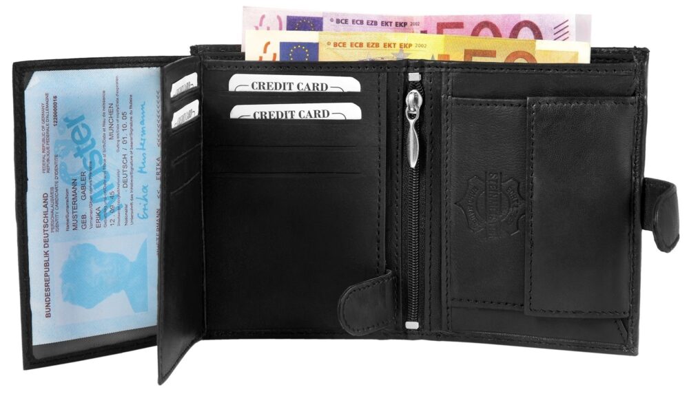 - A carteira pode ser aberta e fechada com um fecho de pressão, e as ranhuras para cartões de crédito e os compartimentos para cartões de identificação são fechados com um fecho de pressão.