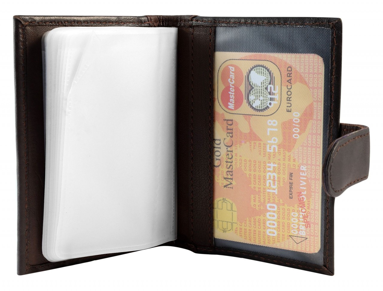 O porta-cartões em formato retrato da marca Steinmeister é feito de couro genuíno. O organizador de cartões também possui 3 compartimentos para cartões de crédito, 1 compartimento transparente para identificação e 16 compartimentos transparentes para cartões, que são fixados no meio com uma costura simples e garantem uma divisão organizada. Graças ao design plano, o estojo de couro pode ser guardado em qualquer lugar e ainda oferece espaço suficiente para guardar objetos de valor com segurança e organização quando estiver em trânsito. As dimensões da caixa do cartão são 11 cm de comprimento, 7,5 cm de largura e 1,5 cm de espessura. Este organizador não só é super prático, como também é um excelente presente para quem você ama. É o companheiro ideal, seja em viagem, no dia a dia ou numa reunião de negócios.