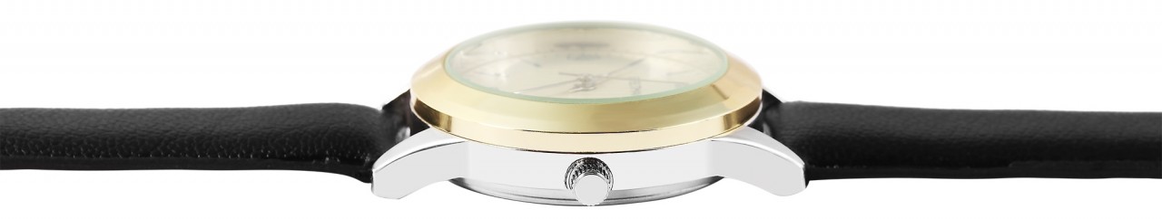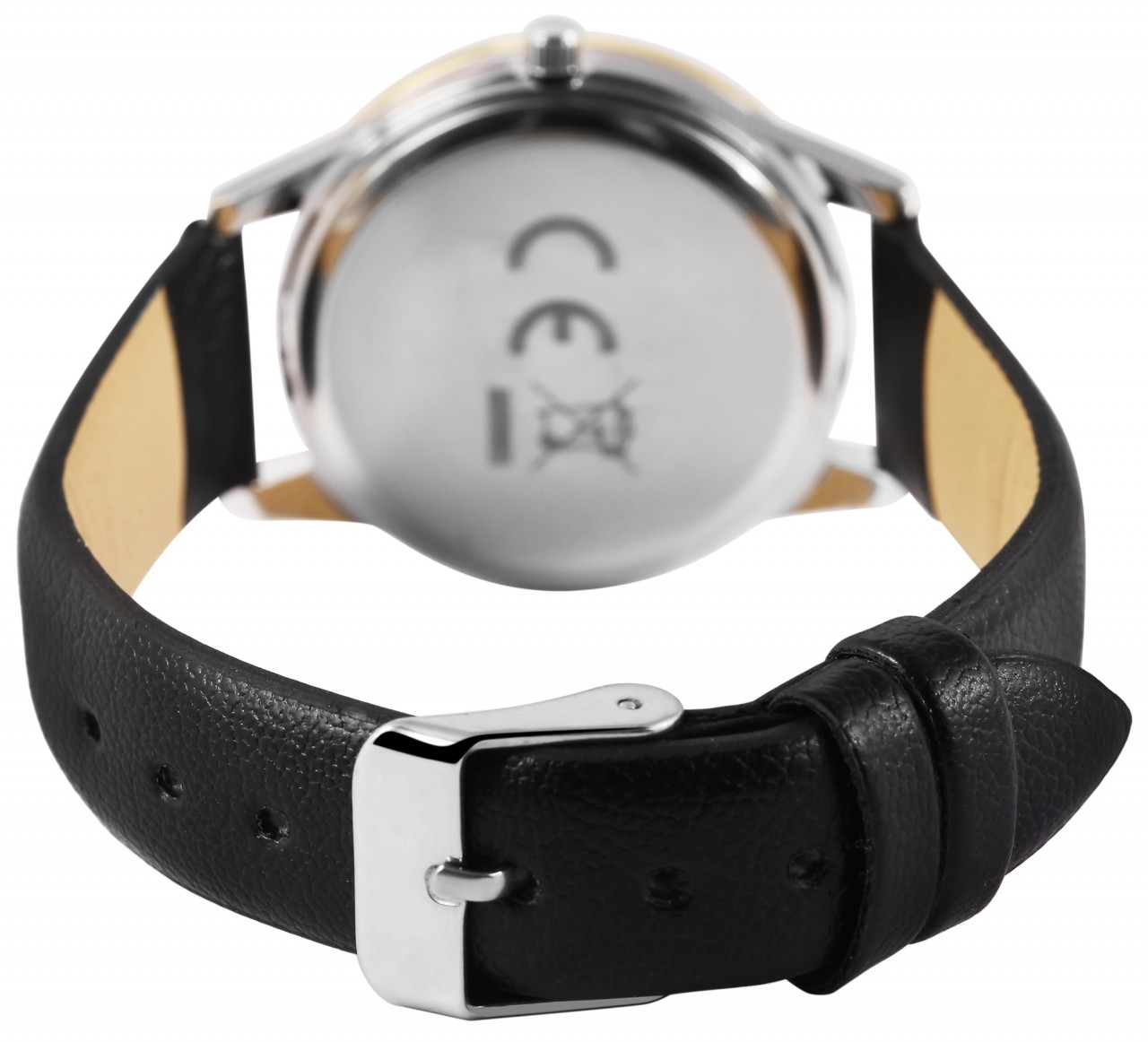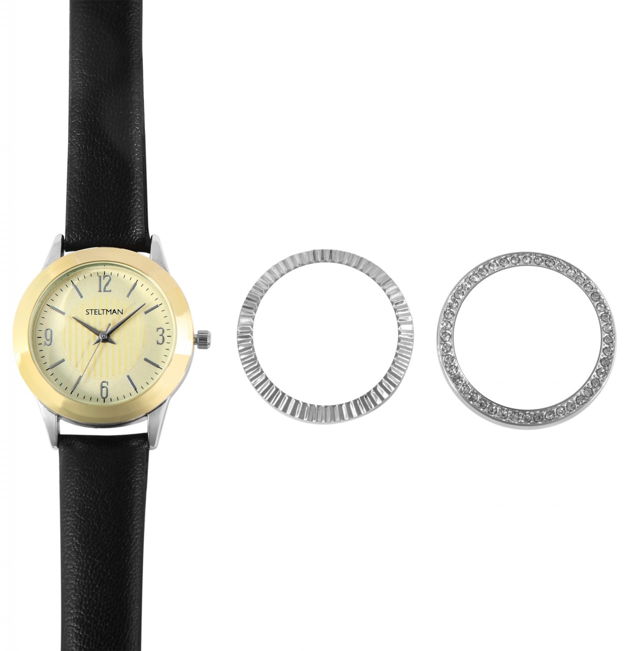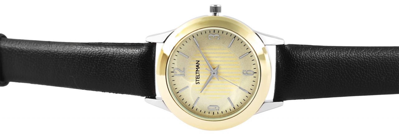 O relógio de pulso analógico de 3 ponteiros para senhora da marca Steltman possui um movimento de quartzo de alta qualidade. A bracelete em Pele Sintética preta tem 16 mm de largura na extremidade e afunila para 14 mm no fecho. O relógio pode ser aberto e fechado com uma fivela de pino prateada. O comprimento total do relógio é de 23,5 cm. A caixa metálica prateada com vidro mineral tem um diâmetro de 33 mm e uma altura de 10 mm. O fundo da caixa é feito de aço inoxidável. O mostrador é de cor creme e está decorado com um padrão às riscas no centro. Os ponteiros, os números e os marcadores das horas são prateados e combinam bem com o aspeto geral do relógio. A caraterística especial deste relógio é o facto de a luneta poder ser substituída. Esta pode ser aparafusada à caixa através de uma rosca.