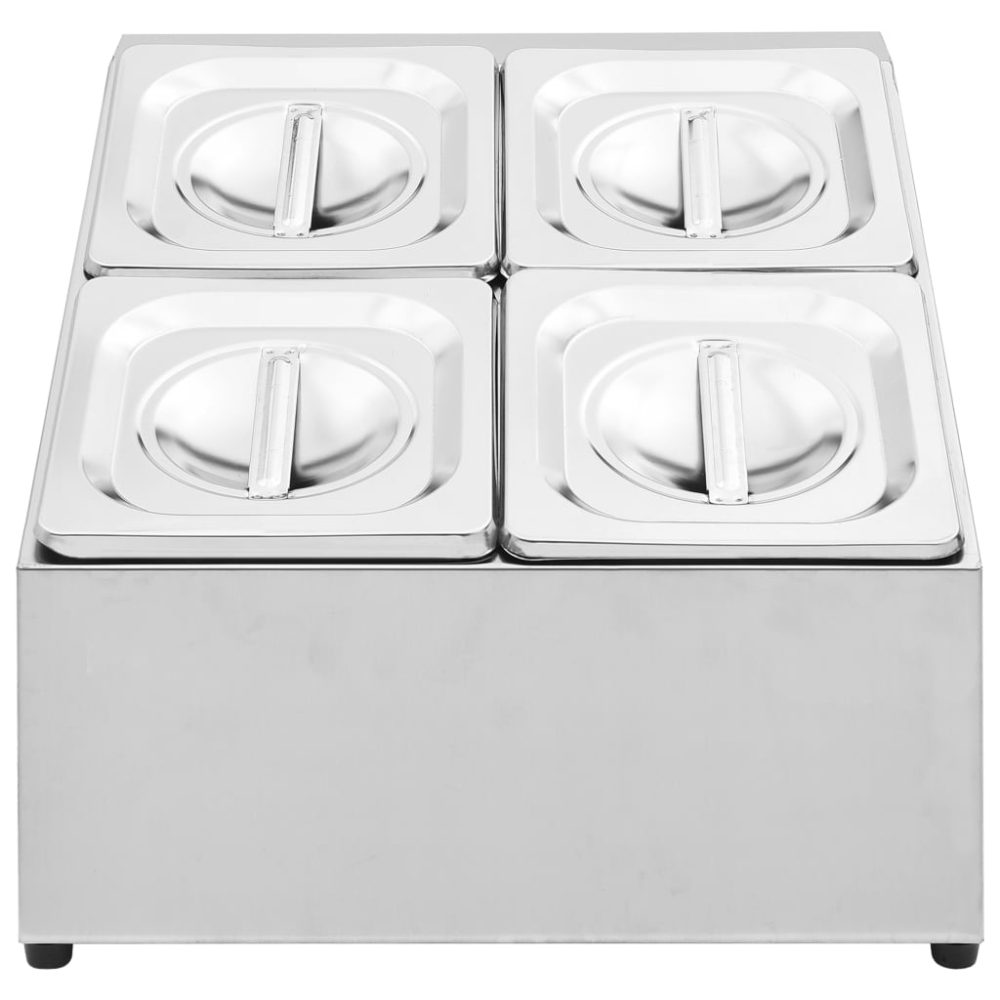 Este recipiente para saladas, feito de aço inoxidável, pode ser lavado na máquina de lavar louça e é fácil de limpar. Os pés de borracha antiderrapantes garantem um suporte estável e protegem a superfície de trabalho de arranhões. Este buffet de saladas também inclui 4 recipientes GN 1/6, que podem ser separados para facilitar o enchimento e esvaziamento. As tampas correspondentes estão incluídas, para poder manter o conteúdo fresco, seguro e livre de insetos.