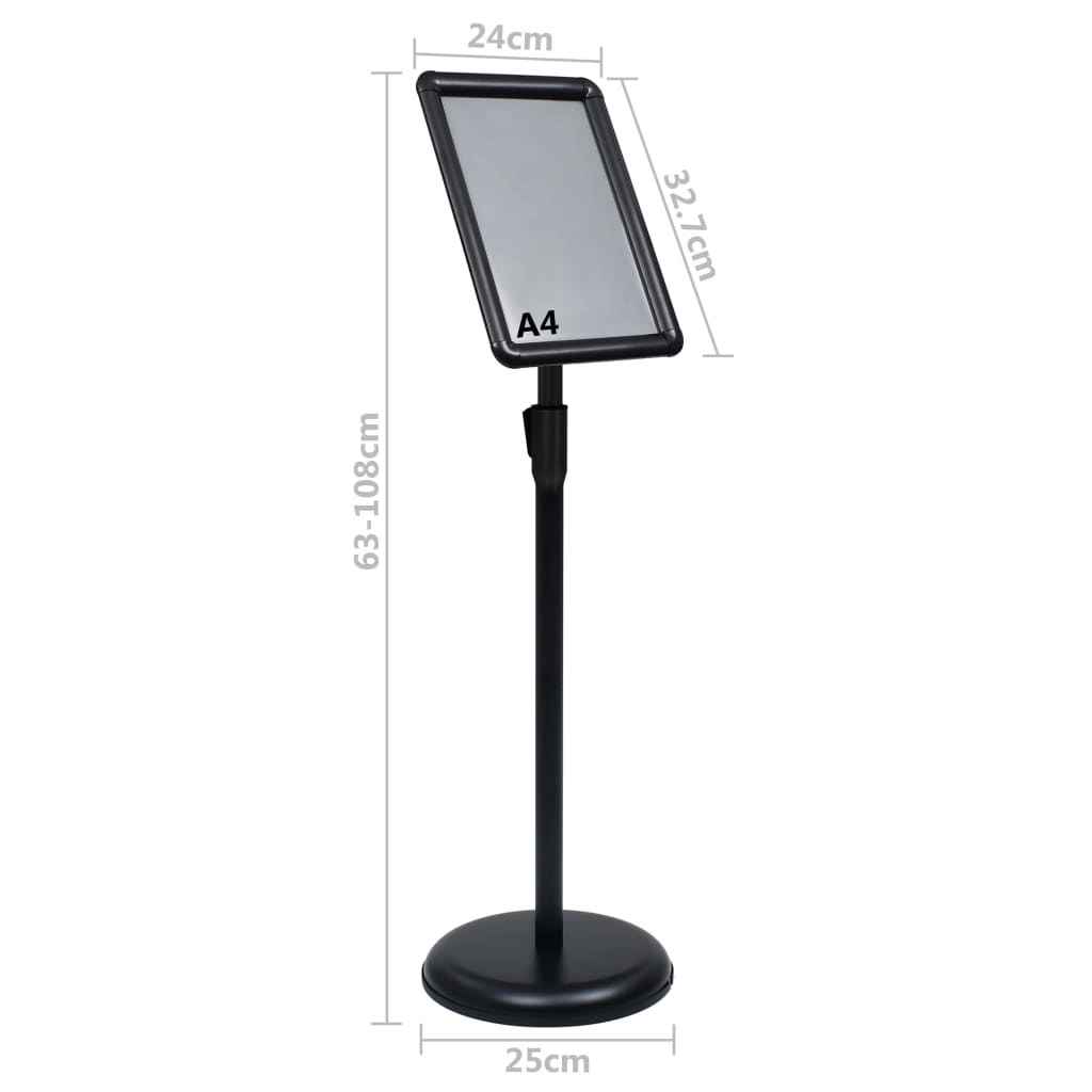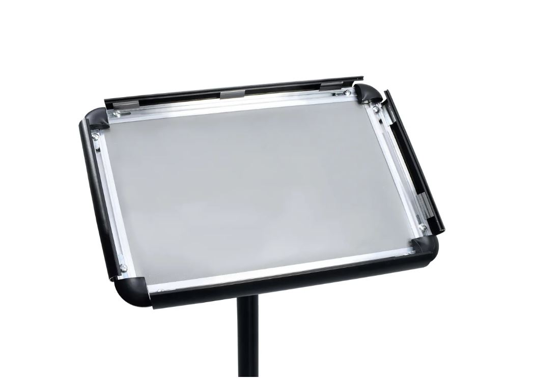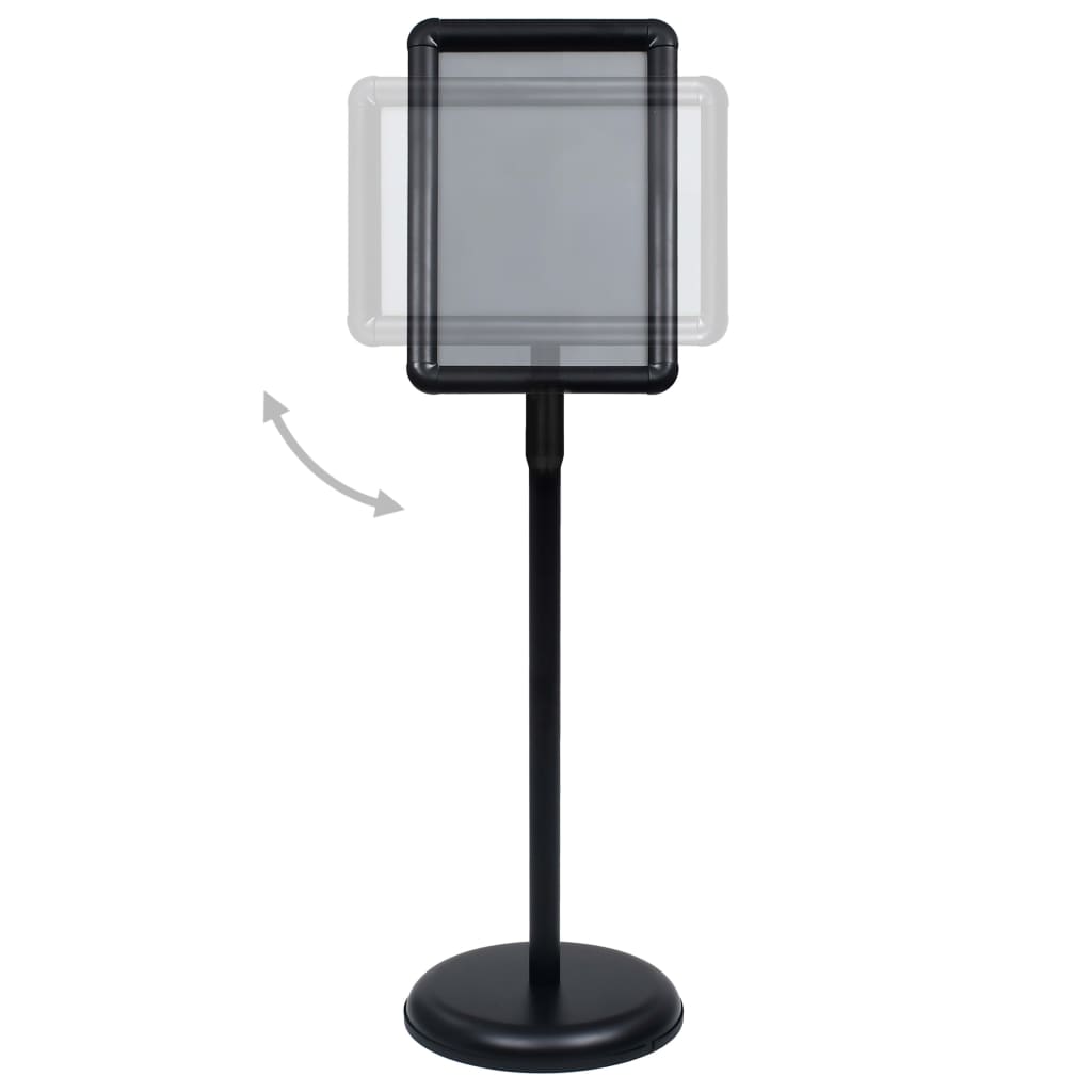 Este suporte para cartazes é totalmente ajustável para ir ao encontro das suas variadas necessidades de exposição. Construído com uma estrutura em liga de alumínio leve e durável, este suporte em pedestal pode acomodar 1 folha A4 comum. O seu painel pode ser rodado em qualquer ângulo, com uma forte flexibilidade. A película de PVC transparente protege o painel do pó e das impressões digitais e mantém a nitidez de leitura do cartaz. O sistema de clique permite a instalação rápida de qualquer cartaz. A sua pequena dimensão ocupa pouco espaço e é fácil de transportar.