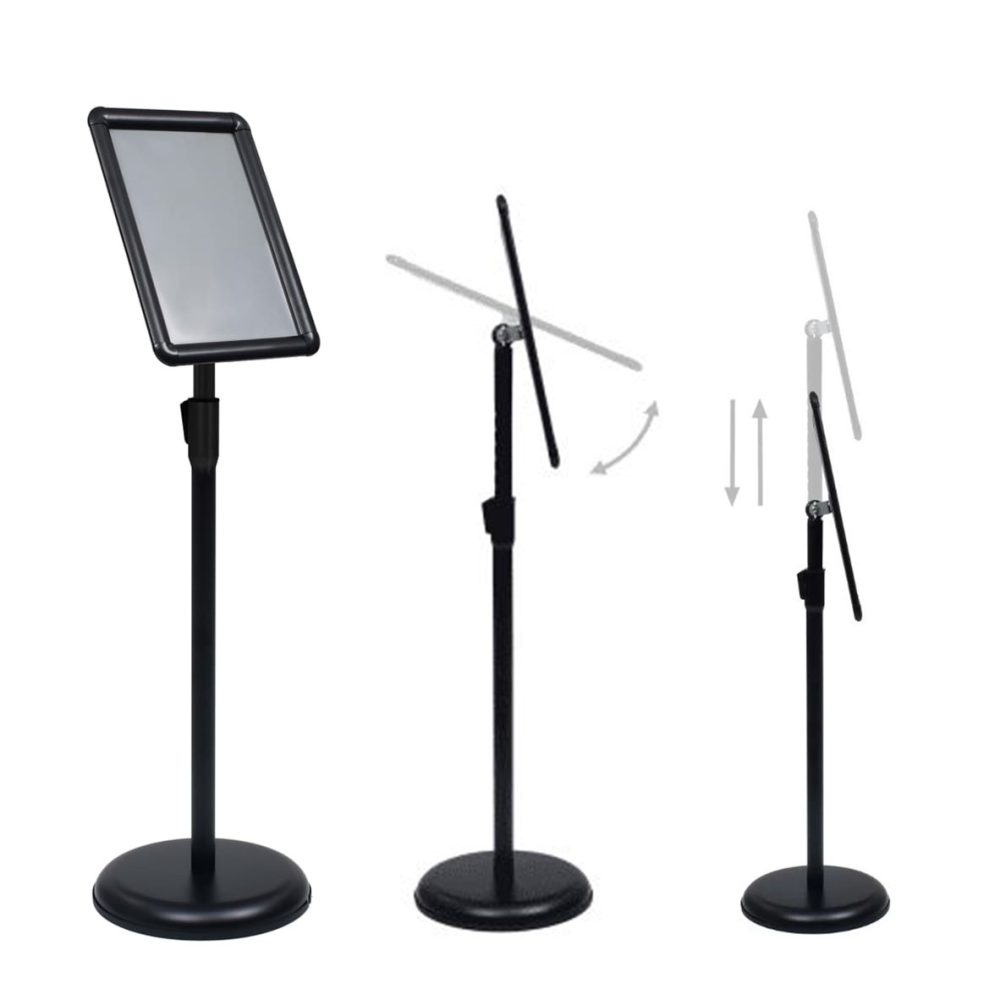 Este suporte para cartazes é totalmente ajustável para ir ao encontro das suas variadas necessidades de exposição. Construído com uma estrutura em liga de alumínio leve e durável, este suporte em pedestal pode acomodar 1 folha A4 comum. O seu painel pode ser rodado em qualquer ângulo, com uma forte flexibilidade. A película de PVC transparente protege o painel do pó e das impressões digitais e mantém a nitidez de leitura do cartaz. O sistema de clique permite a instalação rápida de qualquer cartaz. A sua pequena dimensão ocupa pouco espaço e é fácil de transportar.