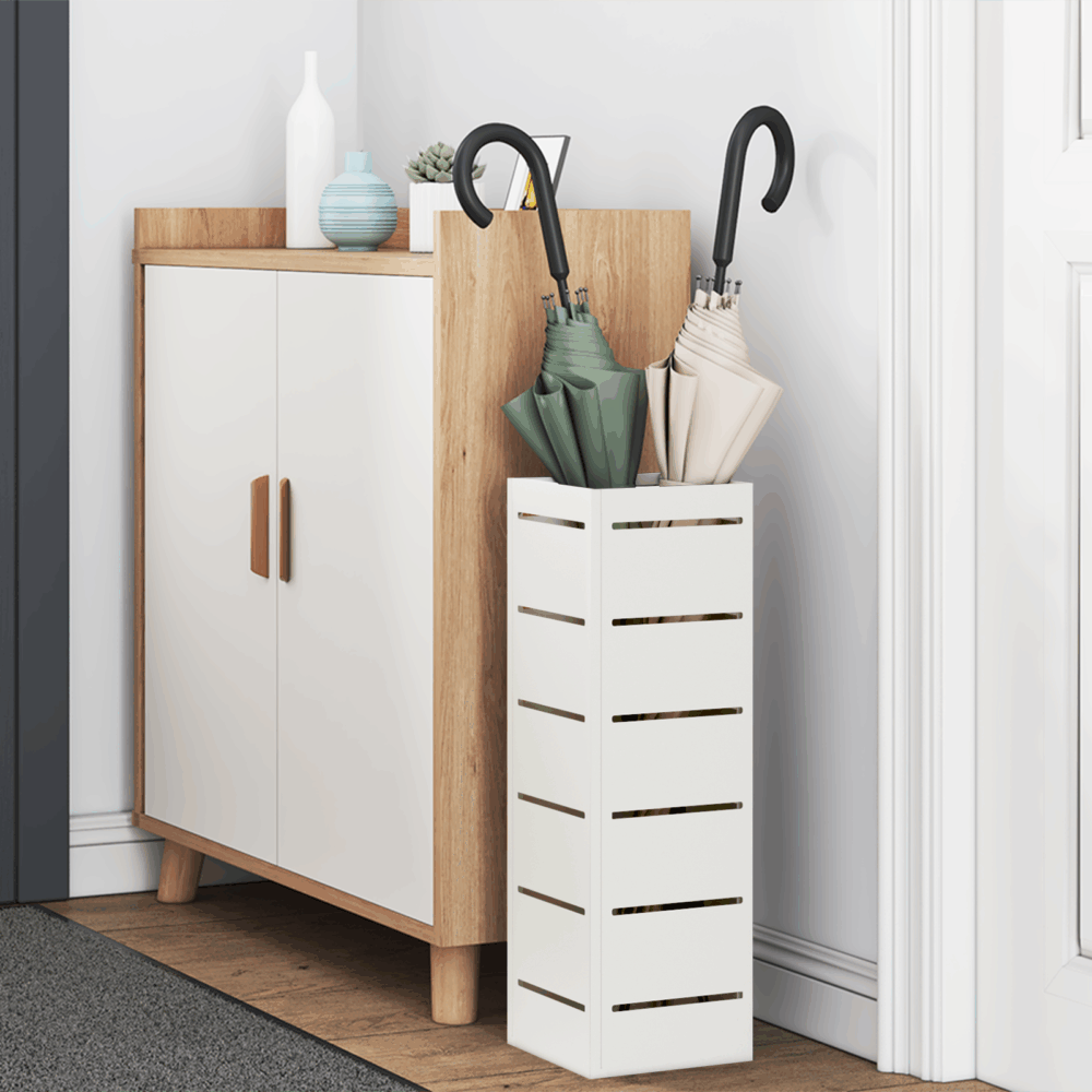 Este suporte para guarda-chuva é um toque estiloso para qualquer entrada, com um acabamento branco limpo que fica bem enquanto faz o seu trabalho. Totalmente feito para guardar guarda-chuvas de todos os tamanhos, mantém o corredor arrumado e com um visual esperto, e o padrão listrado elegante realmente faz sentir-se bem-vindo. Armazenamento Amplo: Projetado com compartimentos espaçosos para mais do que apenas guarda-chuvas, tornando-o super prático e funcional em corredores modernos. Design Estiloso: O acabamento branco e padrão listrado moderno combinam perfeitamente com a decoração contemporânea, adicionando um clima fresco a qualquer espaço. Tamanho Compacto: No tamanho ideal para áreas menores, permitindo que se utilizem entradas apertadas sem entulhar. Durabilidade: Feito de madeira de alta qualidade, este suporte para guarda-chuva é sólido e suporta o uso diário, transformando-se numa adição duradoura à casa. Fácil de Limpar: O acabamento brilhante quase não precisa de manutenção; apenas um rápido pano mantém a sua aparência impecável.