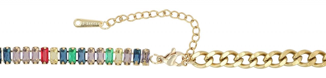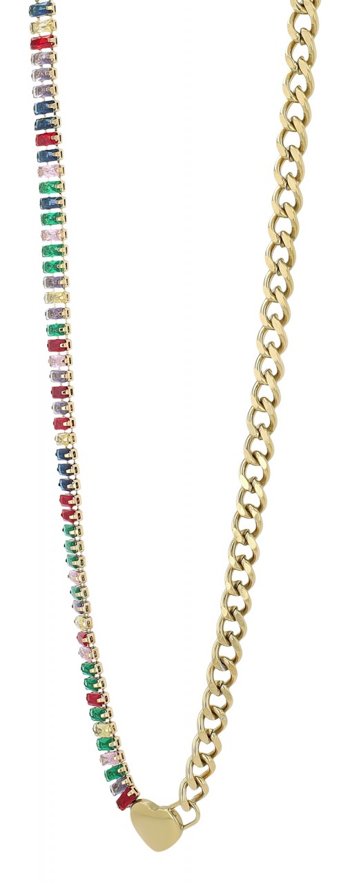 O colar “Talea” combina elegância e design moderno. Uma corrente de ténis com pedras coloridas em forma de baguete de um lado e uma corrente clássica do outro lado. Ambas as partes da cadeia são unidas no meio por um coração sólido. Use o colar no dia a dia com um top simples ou para uma ocasião especial com um vestido de noite, este colar com certeza chamará a atenção no seu decote. Características do produto: Marca: Akzent Materiais: Aço inoxidável de alta qualidade com pedras de vidro coloridas Variantes: prateado e dourado Comprimento: 40 cm e extensão de 5 cm Fecho: mosquetão seguro em aço inoxidável Design: corrente de ténis e corrente de meio-fio com um pingente de coração