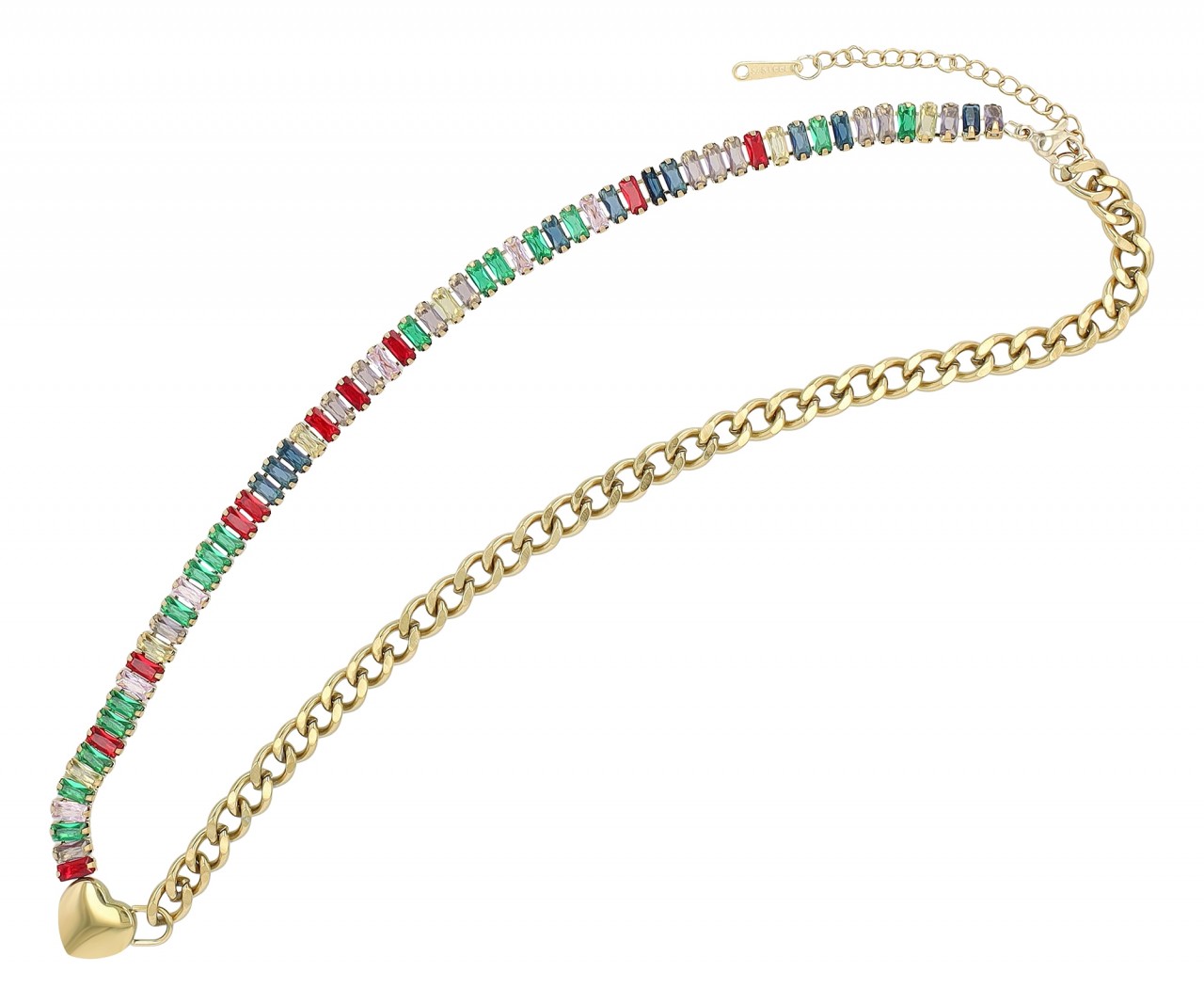 O colar “Talea” combina elegância e design moderno. Uma corrente de ténis com pedras coloridas em forma de baguete de um lado e uma corrente clássica do outro lado. Ambas as partes da cadeia são unidas no meio por um coração sólido. Use o colar no dia a dia com um top simples ou para uma ocasião especial com um vestido de noite, este colar com certeza chamará a atenção no seu decote.